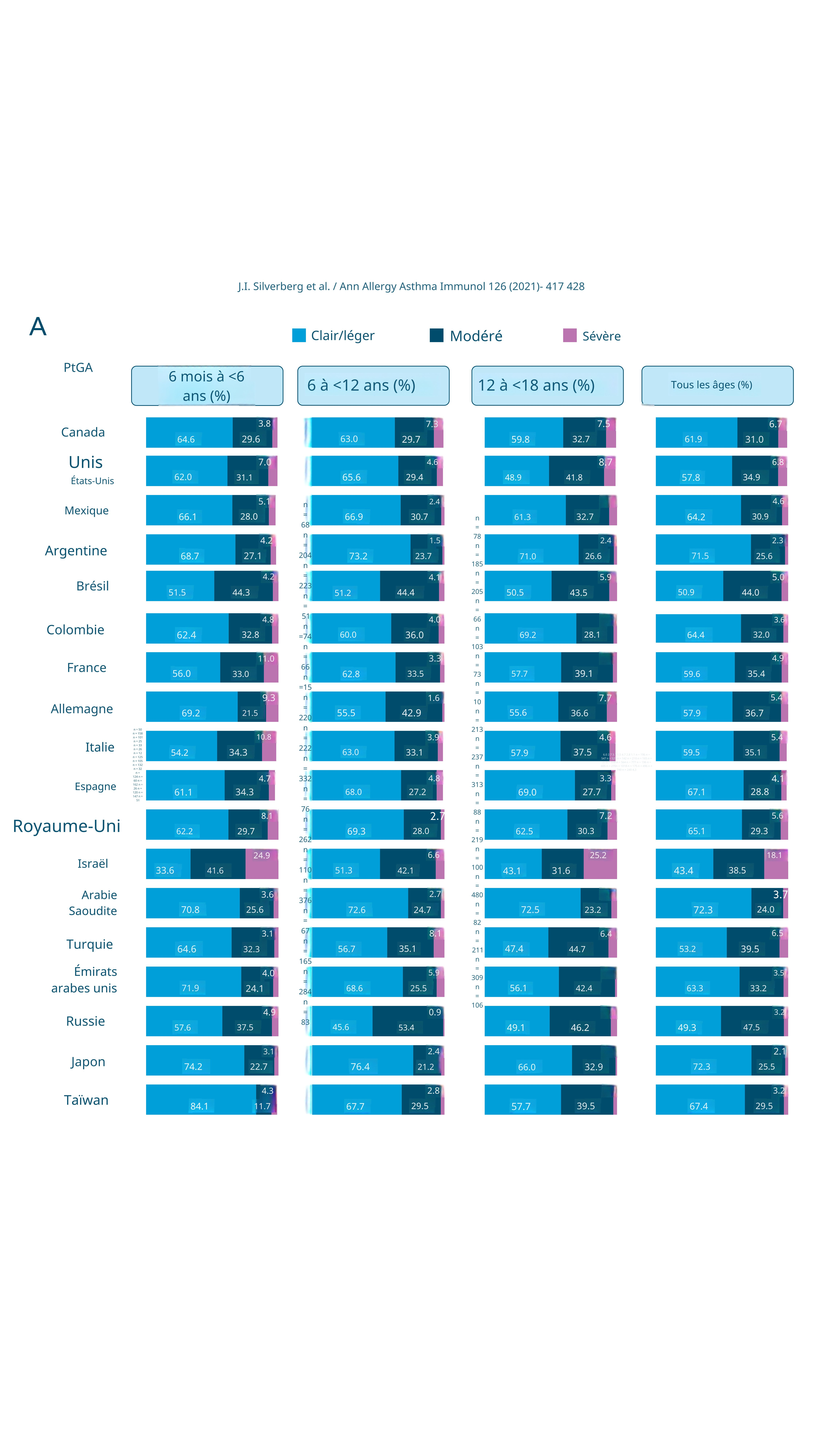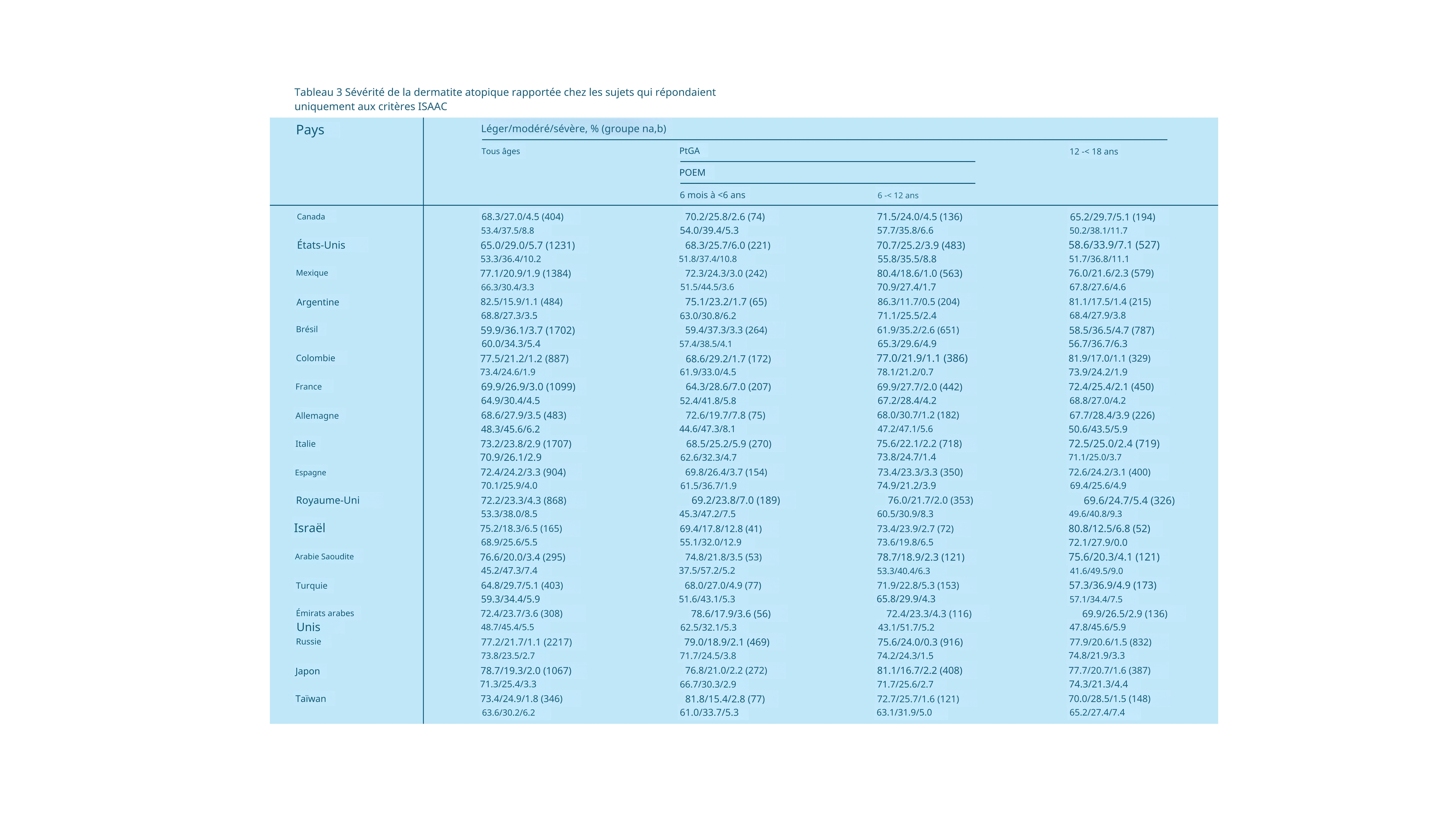 Comme observé chez les adultes atteints de dermatite atopique (DA),¹ les formes légères ou modérées étaient les plus fréquentes chez les enfants, indépendamment de l'âge, du pays et du mode d'évaluation (PtGA ou POEM). Dans la présente analyse, la proportion d'enfants atteints de DA modérée était généralement supérieure aux 26,0 % rapportés dans une population pédiatrique américaine d'après l'Enquête nationale sur la santé des enfants de 2007¹³. Cette différence s'explique probablement par les critères d'inclusion : la présente analyse exigeait de répondre aux critères ISAAC et d'avoir reçu un diagnostic d'eczéma par un médecin ou un professionnel de santé, tandis que l'autre étude ne requérait que le second critère. La prévalence des formes sévères de DA était constamment faible et, à quelques exceptions près, inférieure à 15 % chez les enfants atteints de DA dans chaque pays. Une certaine disparité dans la catégorisation de la gravité a été observée entre le POEM et le PtGA, qui mesurent des concepts différents. Bien que le POEM soit basé sur les signes et symptômes et recommandé par l'initiative HOME (Harmonising Outcome Measures for Eczema) comme mesure de base des symptômes rapportés par les patients, le PtGA est une mesure globale considérée comme une évaluation plus holistique de la gravité que les mesures cliniques de la maladie. En effet, il offre une perspective plus large du patient et reflète la gravité et l'étendue des lésions, la fréquence des symptômes, l'intensité des démangeaisons et des douleurs cutanées, ainsi que les symptômes d'anxiété et de dépression . En cas de disparité entre ces deux mesures, le POEM a généralement conduit à une prévalence légèrement supérieure de dermatite atopique modérée et inférieure de dermatite atopique légère par rapport au PtGA, comme observé dans une autre étude. Cette disparité reflète probablement l'évaluation par le POEM de la fréquence des symptômes, notamment des démangeaisons, qui contribuent à l'évaluation de la gravité ; la gravité pourrait être surestimée chez les patients présentant des symptômes fréquents et une forme légère de la maladie, selon le POEM, comparativement à d'autres mesures de gravité. De plus, des différences peuvent exister entre le PtGA et le POEM lorsqu'ils sont évalués par un parent chez les enfants de moins de 12 ans. À cet égard, il convient également de noter qu'il semblait y avoir une plus grande cohérence entre les mesures chez les adolescents, probablement parce que leur perception globale correspond à l'activité de la maladie.