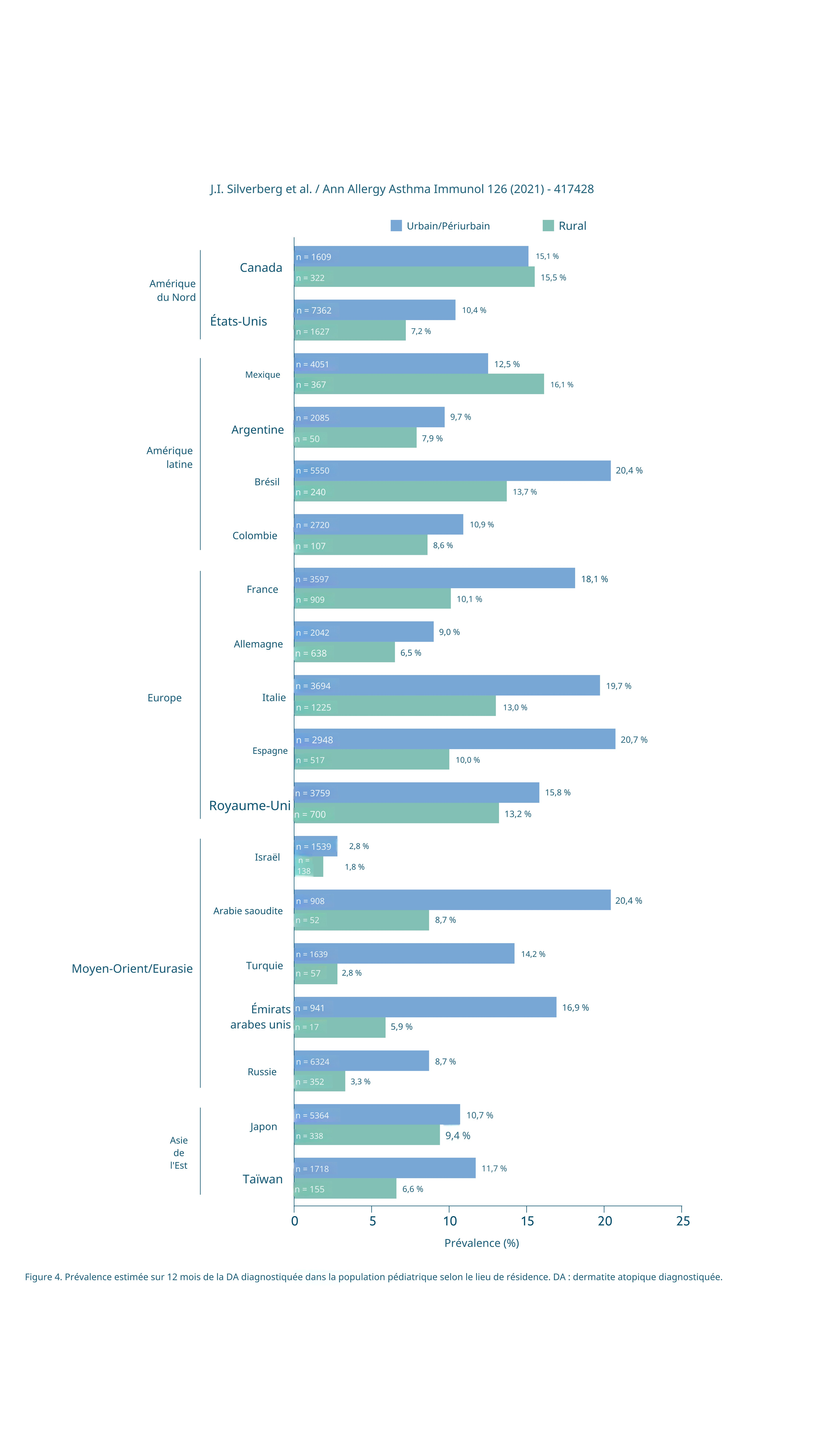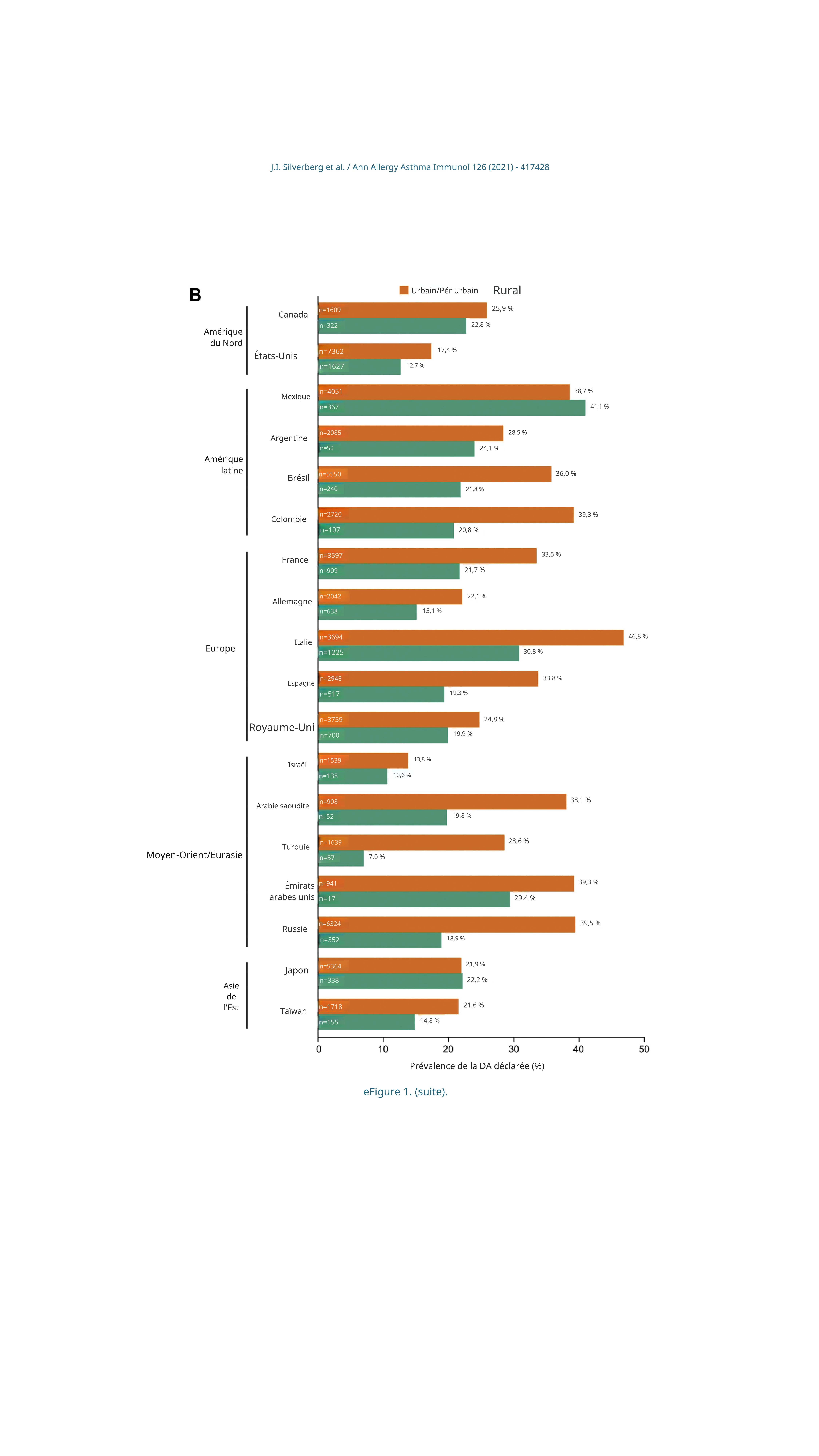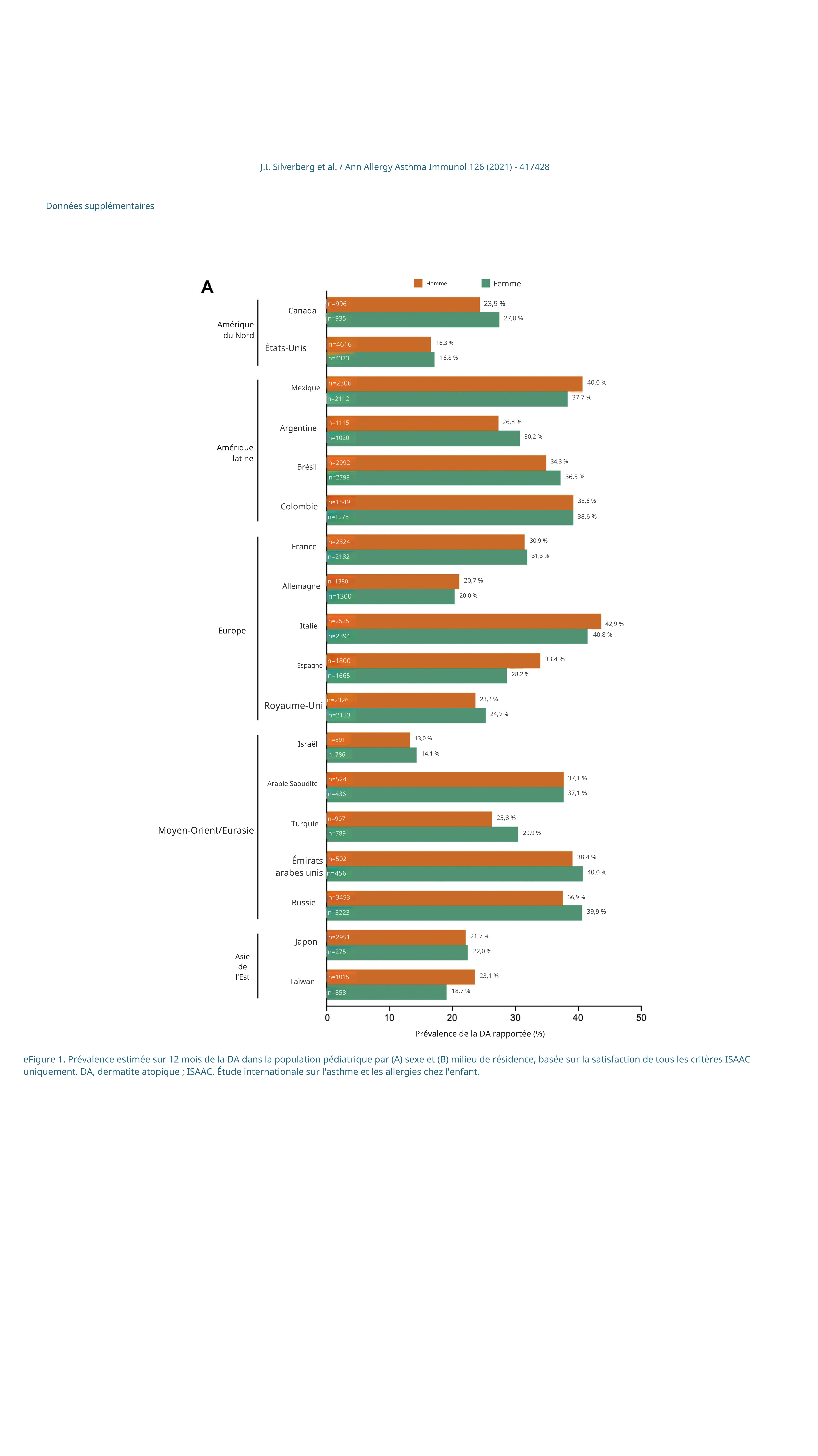 La prévalence de la dermatite atopique (DA) sur 12 mois, évaluée selon les critères ISAAC et la déclaration d'un diagnostic d'eczéma posé par un médecin, présente une variabilité importante selon les pays et les régions géographiques (Fig. 2A). La prévalence pédiatrique globale de la DA était de 9,8 % aux États-Unis et de 15,1 % au Canada, et variait de 9,7 % (Argentine) à 20,1 % (Brésil) en Amérique latine (Fig. 2A). En Europe, l'Allemagne affichait la prévalence la plus faible (8,4 %), tandis que l'Espagne et l'Italie présentaient les prévalences les plus élevées (18,6 % et 17,6 % respectivement). Au Royaume-Uni, pays plus septentrional, la prévalence était légèrement inférieure (15,3 %). Israël présentait la prévalence la plus faible (2,7 %), non seulement parmi les pays du Moyen-Orient et d'Eurasie (où elle variait de 8,4 % en Russie à 19,8 % en Afrique du Sud), mais aussi parmi tous les pays étudiés. En Asie de l'Est, les taux étaient similaires au Japon (10,7 %) et à Taïwan (11,3 %).