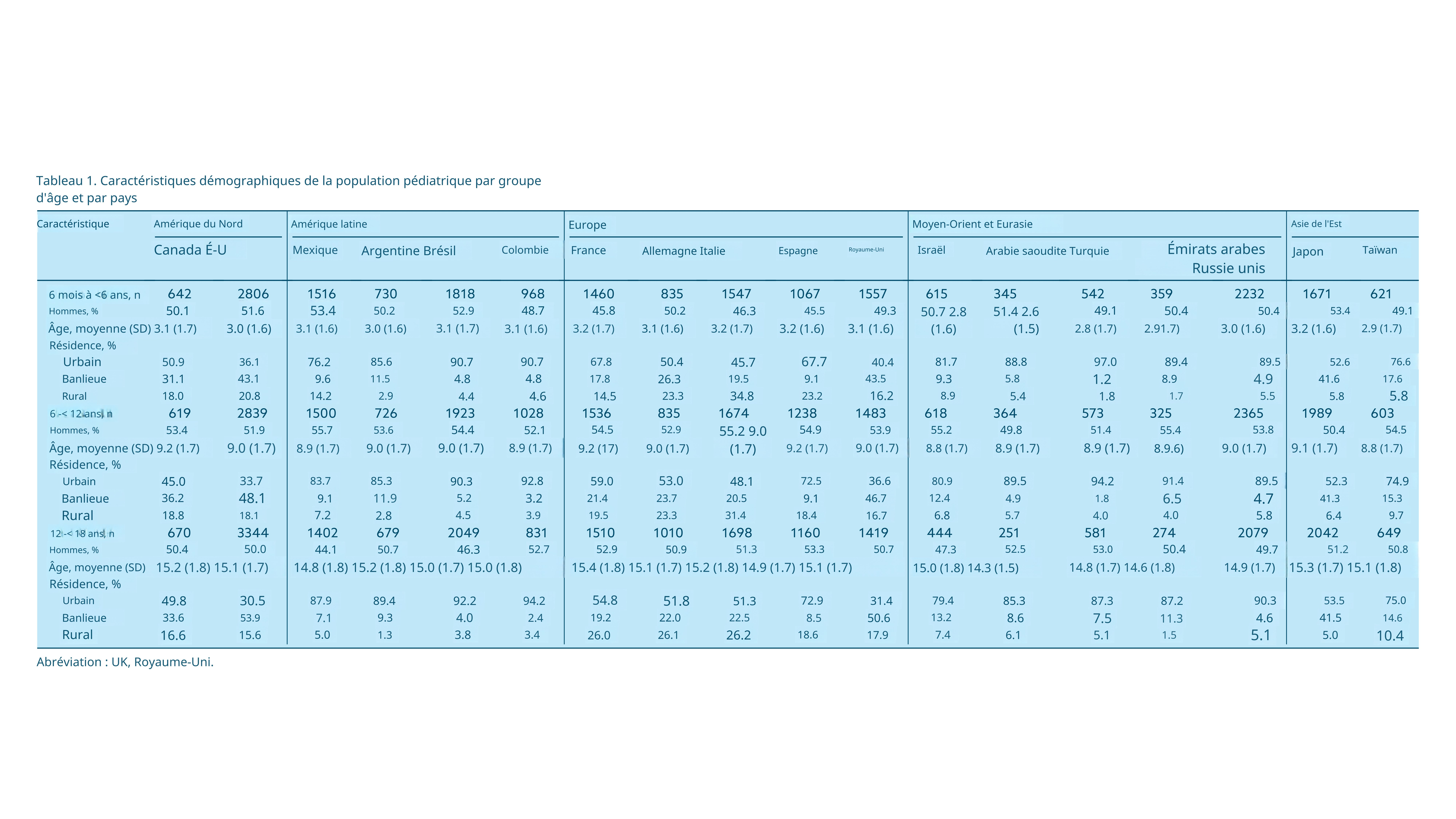 La population étudiée comprenait 65 661 sujets pédiatriques : 21 331 jeunes enfants âgés de 6 mois à moins de 6 ans, 22 238 enfants âgés de 6 à moins de 12 ans et 22 092 adolescents âgés de 12 à moins de 18 ans. Les caractéristiques démographiques (tableau 1) étaient représentatives des différents pays ; la répartition régionale au sein de chaque pays l’était également (données non présentées). Toutefois, le lieu de résidence semblait être principalement urbain ou périurbain, bien que la population rurale soit importante en Amérique du Nord et en Europe (tableau 1).