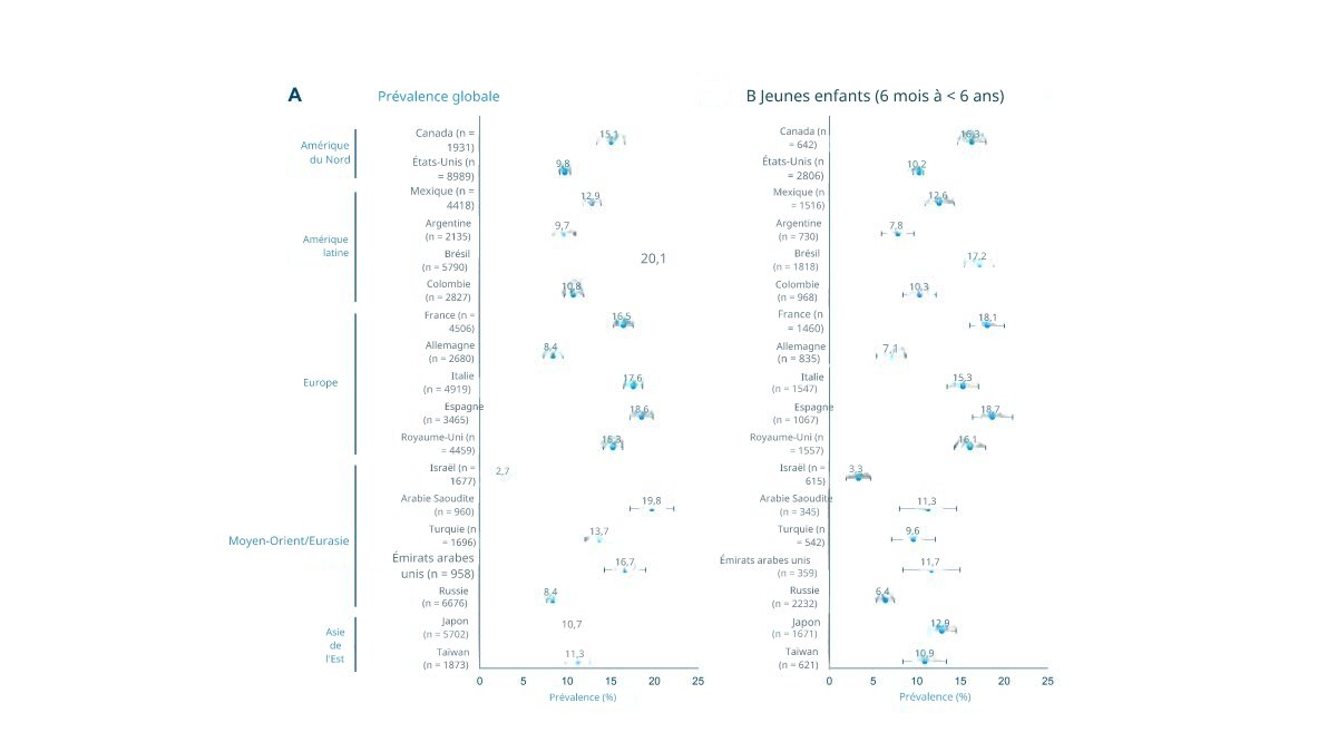 EPI-CARE était une étude transversale multinationale conçue pour représenter les populations pédiatriques générales de pays d'Amérique du Nord (Canada, États-Unis), d'Amérique latine (Argentine, Brésil, Colombie, Mexique), d'Europe (France, Allemagne, Italie, Espagne, Royaume-Uni), du Moyen-Orient et d'Eurasie (Israël, Russie, Arabie saoudite, Turquie, Émirats arabes unis) et d'Asie de l'Est (Japon et Taïwan), selon le sexe, l'âge, la région géographique et le lieu de résidence. L'objectif était d'estimer la prévalence globale dans les pays sélectionnés afin de couvrir un large éventail de régions géographiques, tout en veillant à la praticité de la collecte de données et à la représentativité de l'échantillon pour chaque pays. Les données ont été collectées conformément aux codes de déontologie de la British Healthcare Business Intelligence Association, de l'European Society for Opinion and Marketing Research et de l'European Pharmaceutical Market Research Association, et étaient conformes au Règlement général sur la protection des données (RGPD) de l'Union européenne.