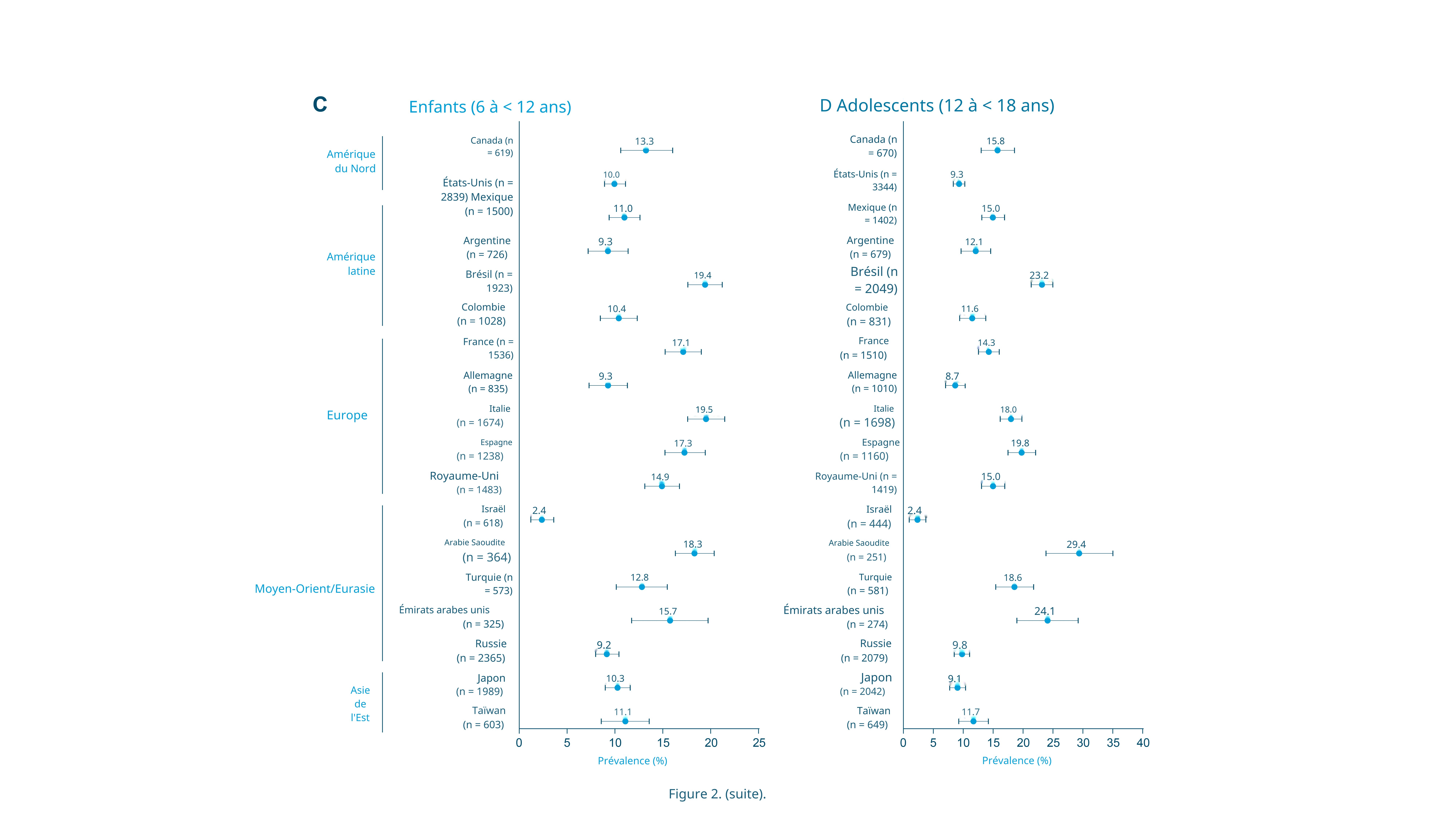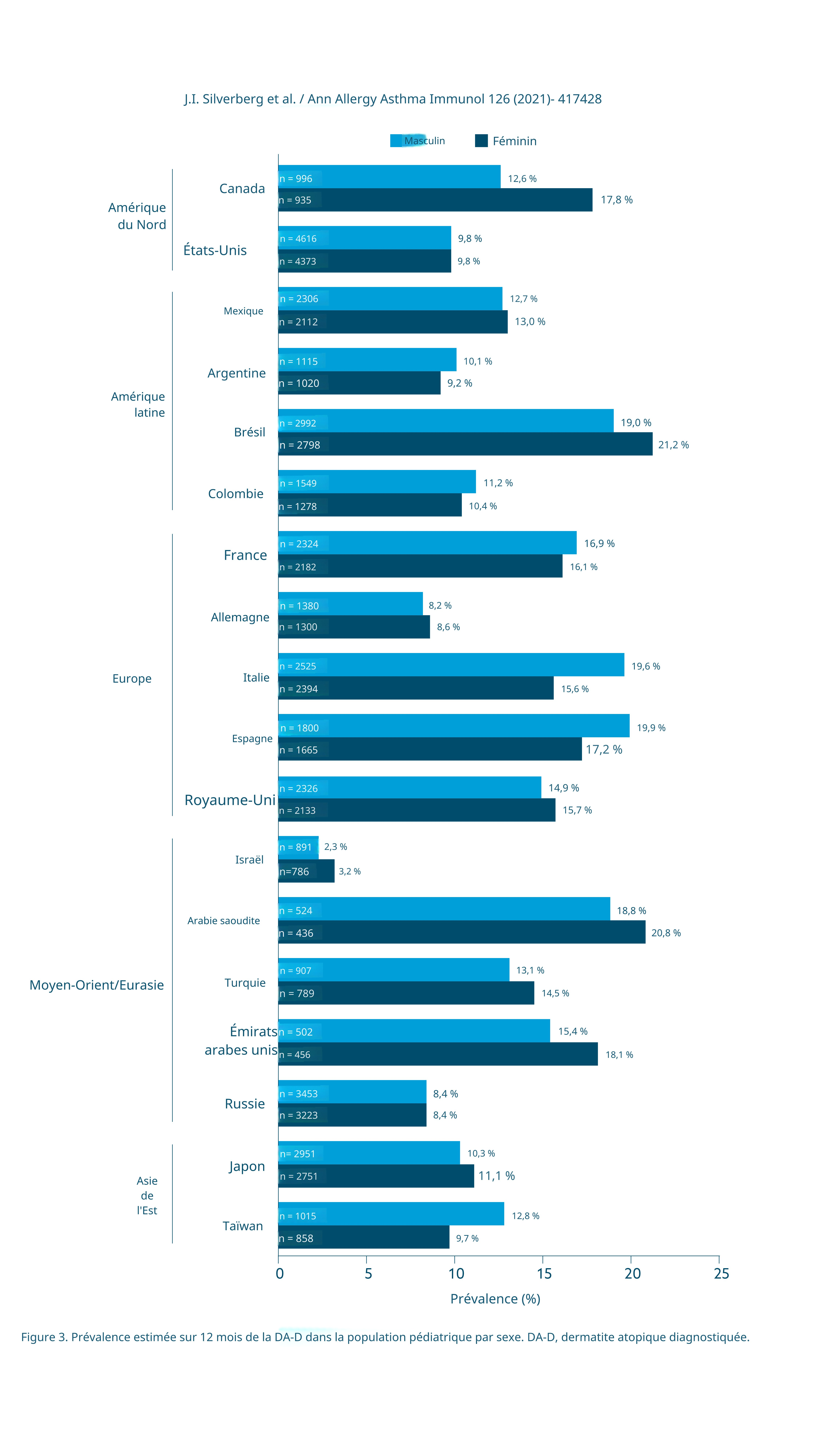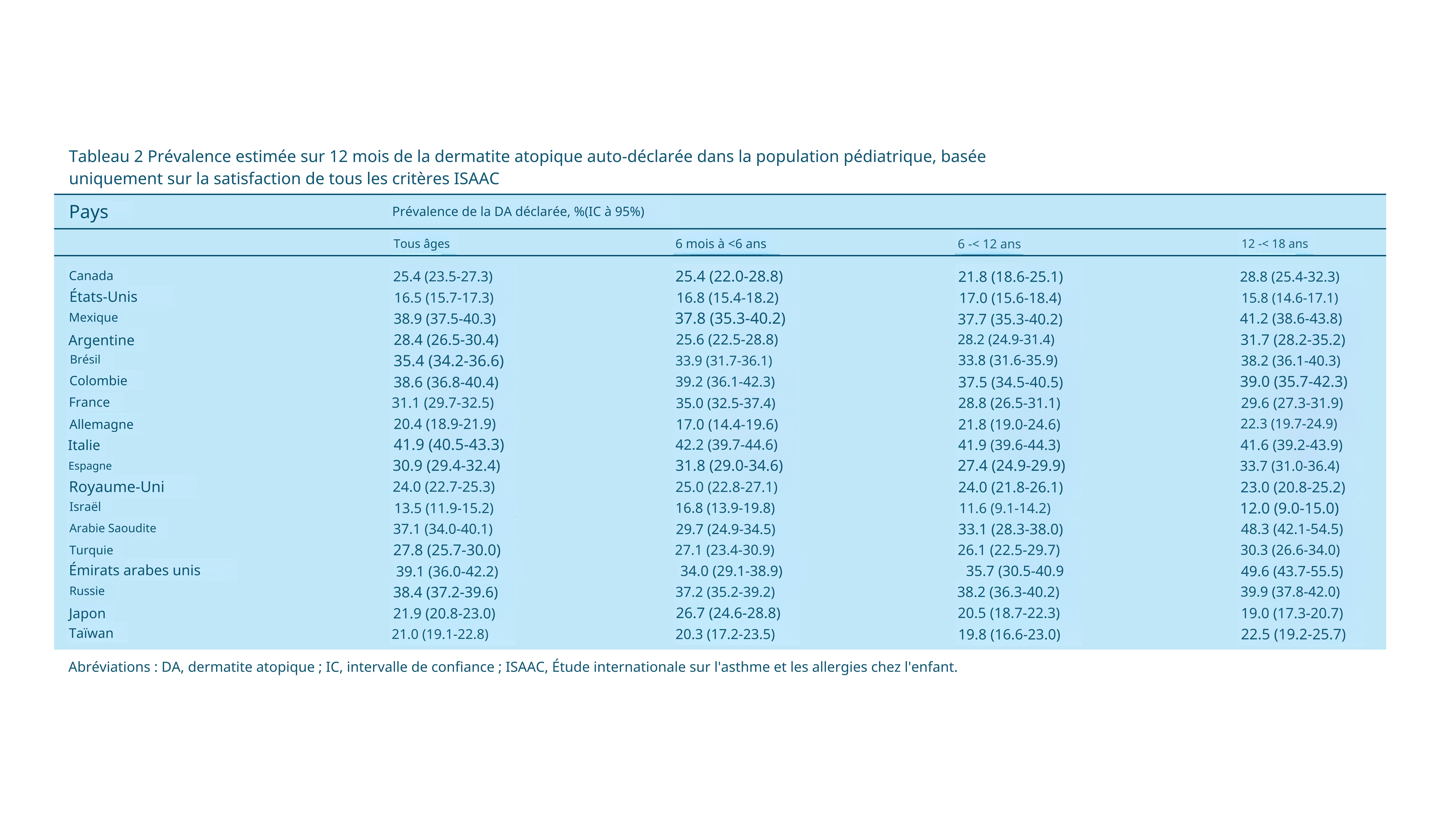 Méthodes : Cette enquête internationale transversale en ligne a été menée auprès d’enfants et d’adolescents (de 6 mois à moins de 18 ans) dans les 18 pays suivants : Amérique du Nord (Canada, États-Unis), Amérique latine (Argentine, Brésil, Colombie, Mexique), Europe (France, Allemagne, Italie, Espagne, Royaume-Uni), Moyen-Orient et Eurasie (Israël, Arabie saoudite, Turquie, Émirats arabes unis, Russie) et Asie de l’Est (Japon, Taïwan). La prévalence a été déterminée selon deux définitions : (1) diagnostic de dermatite atopique (DA) selon les critères de l’Étude internationale sur l’asthme et les allergies chez l’enfant (ISAAC) et déclaration par l’enfant ou ses parents d’avoir déjà reçu un diagnostic de DA (eczéma) par un médecin ; et (2) déclaration de DA basée uniquement sur les critères ISAAC. La gravité a été évaluée à l’aide de l’Évaluation globale du patient (EGP) et de l’Échelle d’eczéma centrée sur le patient (POEM).