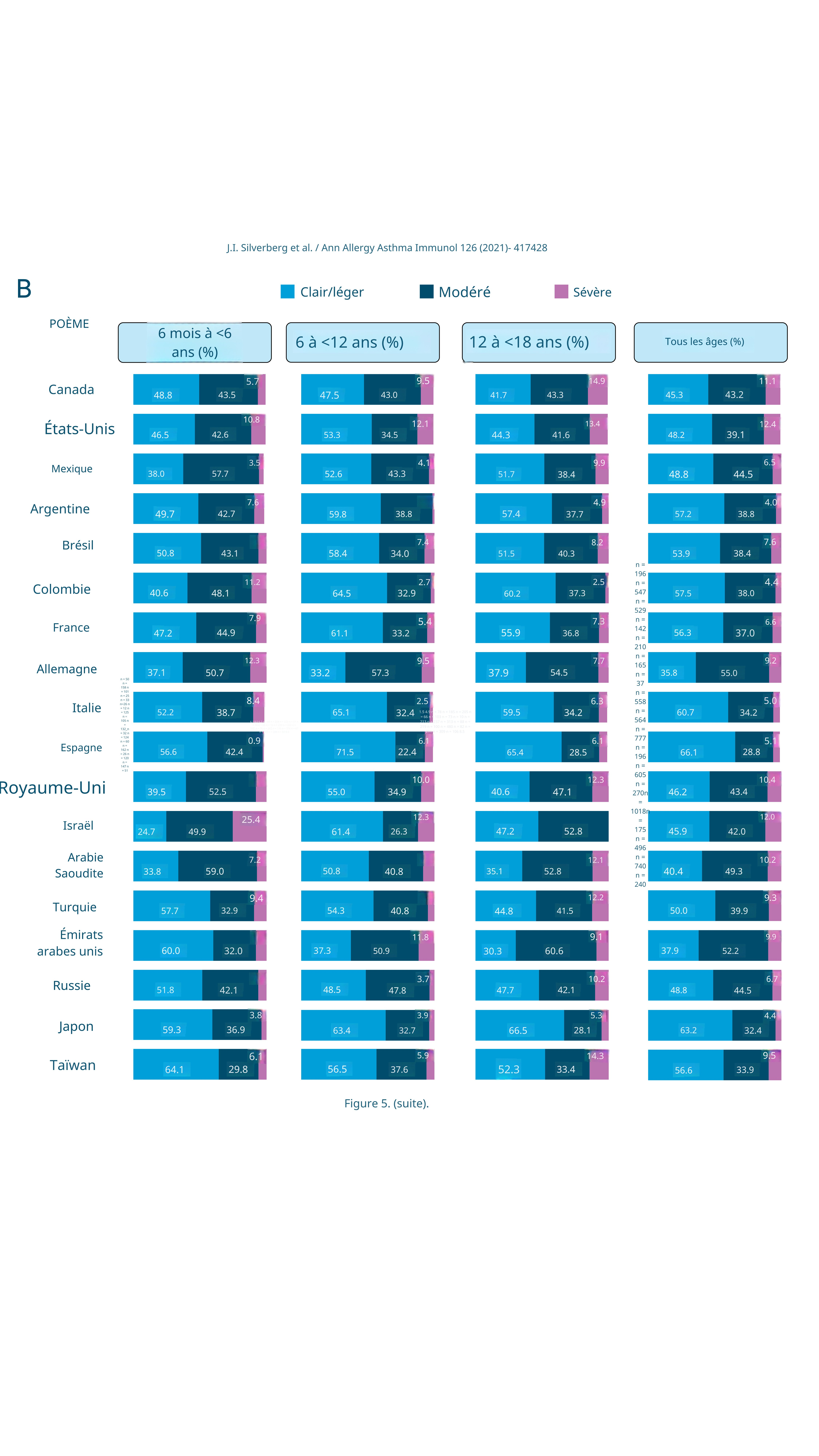 La figure 5 présente la distribution de la gravité de la DAD évaluée à l'aide de l'échelle PtGA (figure 5A) et de l'échelle POEM (figure 5B). Parmi les sujets atteints de DAD, la proportion de formes sévères était faible dans tous les groupes d'âge et globalement dans tous les pays, quelle que soit la mesure de gravité utilisée. La proportion de DAD sévères variait de 0,9 % à 14,9 %, sauf en Israël, où elle était d'environ 25 % chez les jeunes enfants, quelle que soit la mesure utilisée, et de 25,2 % chez les adolescents selon l'échelle PtGA. Cependant, la taille des échantillons pour ces groupes d'âge était réduite en raison de la faible prévalence globale de la DAD en Israël. En considérant les groupes d'âge combinés, la D-AD légère variait de 43,4 % (Israël) à 72,3 % (Afrique du Sud et Japon) sur le PtGA et de 35,8 % (Allemagne) à 66,1 % (Espagne) sur le POEM, avec des plages de AD modérée allant de 24,0 % (Afrique du Sud) à 47,5 % (Russie) et de 28,8 % (Espagne) à 55,0 % (Allemagne) sur les 2 échelles, respectivement (Fig. 5).