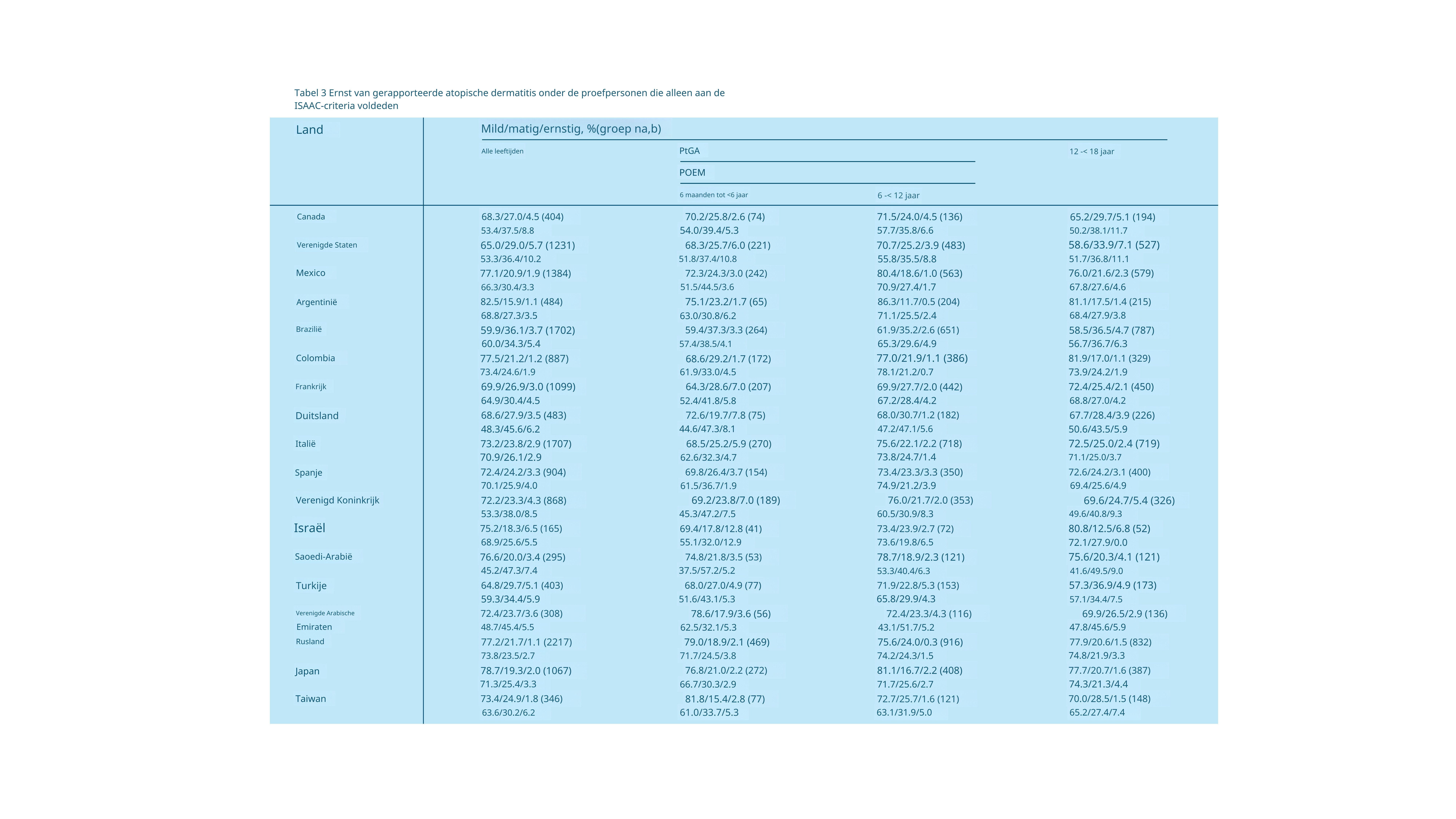 Wanneer alleen de ISAAC-criteria in aanmerking werden genomen, was de prevalentie van zelfgerapporteerde atopische dermatitis (AD) (Tabel 2) hoger dan die van degeneratieve atopische dermatitis (AD-D) en varieerde deze van 13,5% (Israël) tot 41,9% (Italië) in de algemene bevolking; bij jonge kinderen varieerde deze van 16,8% (Israël en de Verenigde Staten) tot 42,2% (Italië); bij kinderen van 6 tot en met 12 jaar van 11,6% (Israël) tot 41,9% (Italië); en bij adolescenten van 12,0% (Israël) tot 49,6% (Verenigde Arabische Emiraten). De waargenomen trends per leeftijd en land waren grotendeels vergelijkbaar met die voor AD-D.