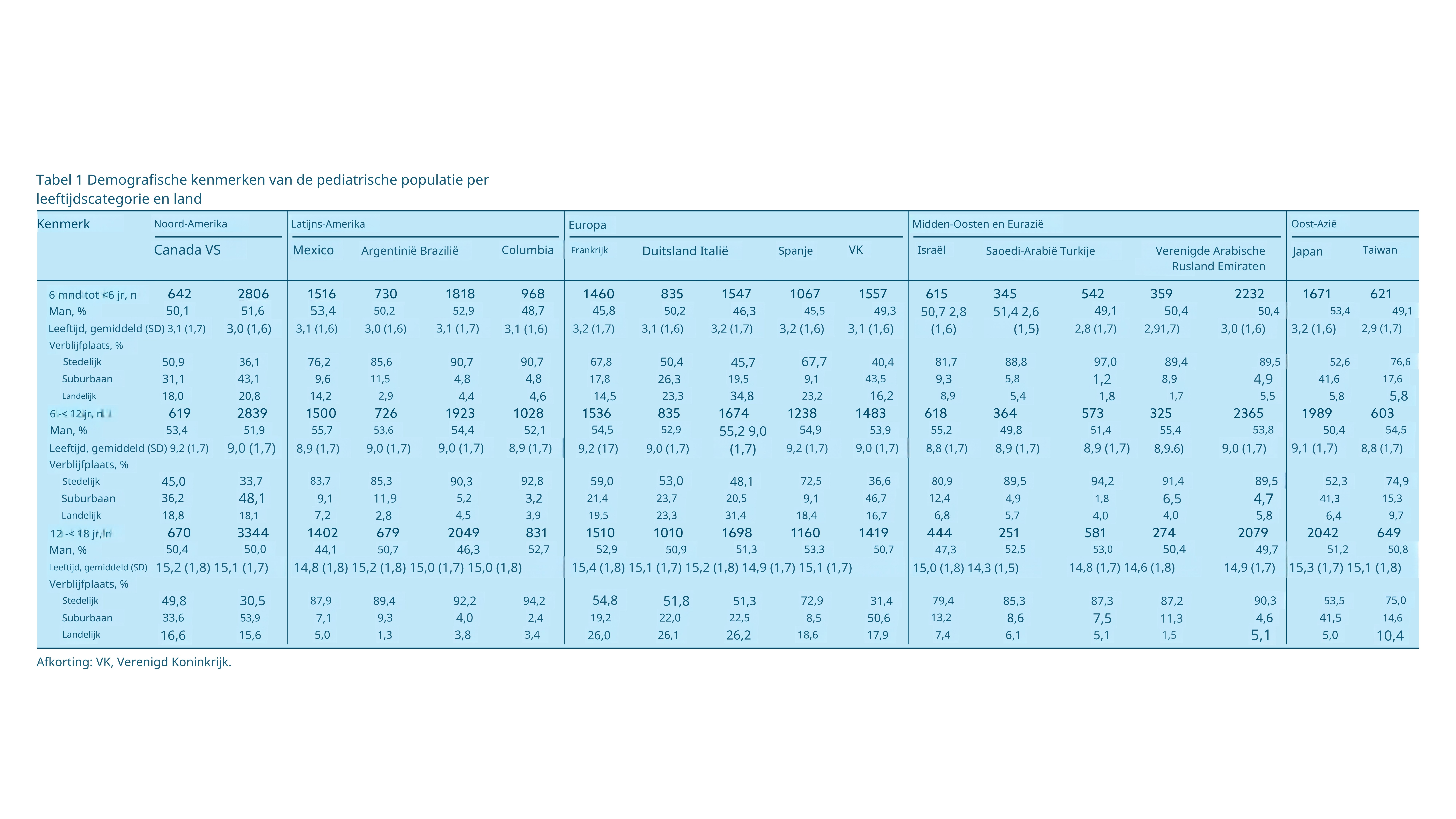 De onderzoekspopulatie bestond uit 65.661 kinderen: 21.331 jonge kinderen van 6 maanden tot en met 6 jaar, 22.238 kinderen van 6 tot en met 12 jaar en 22.092 adolescenten van 12 tot en met 18 jaar. De demografische kenmerken (Tabel 1) waren representatief voor de verschillende landen; de regionale verdeling binnen elk land was eveneens representatief (gegevens niet weergegeven). De woonplaats bleek echter voornamelijk stedelijk of voorstedelijk te zijn, hoewel de plattelandsbevolking aanzienlijk was in Noord-Amerika en Europa (Tabel 1).