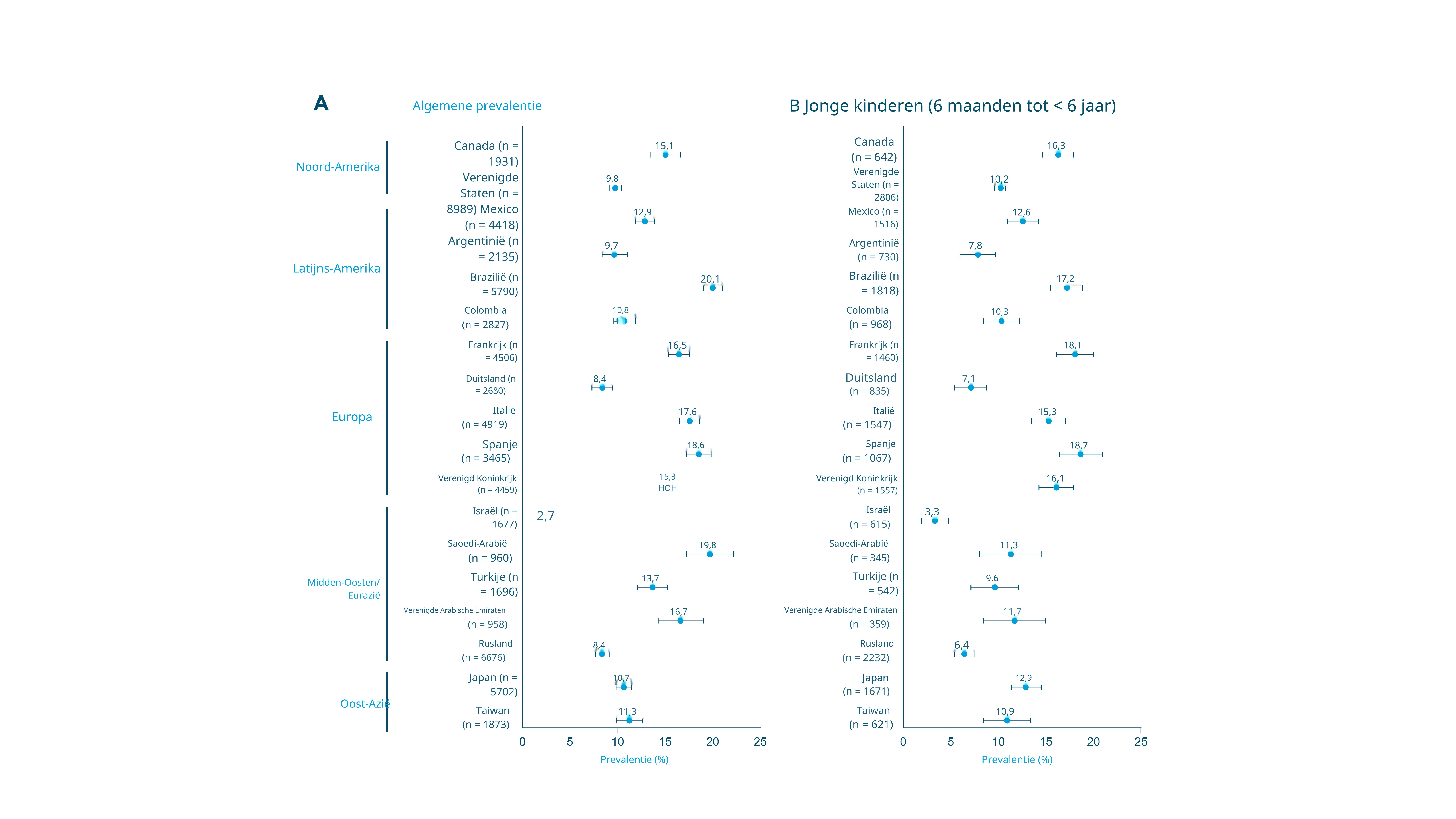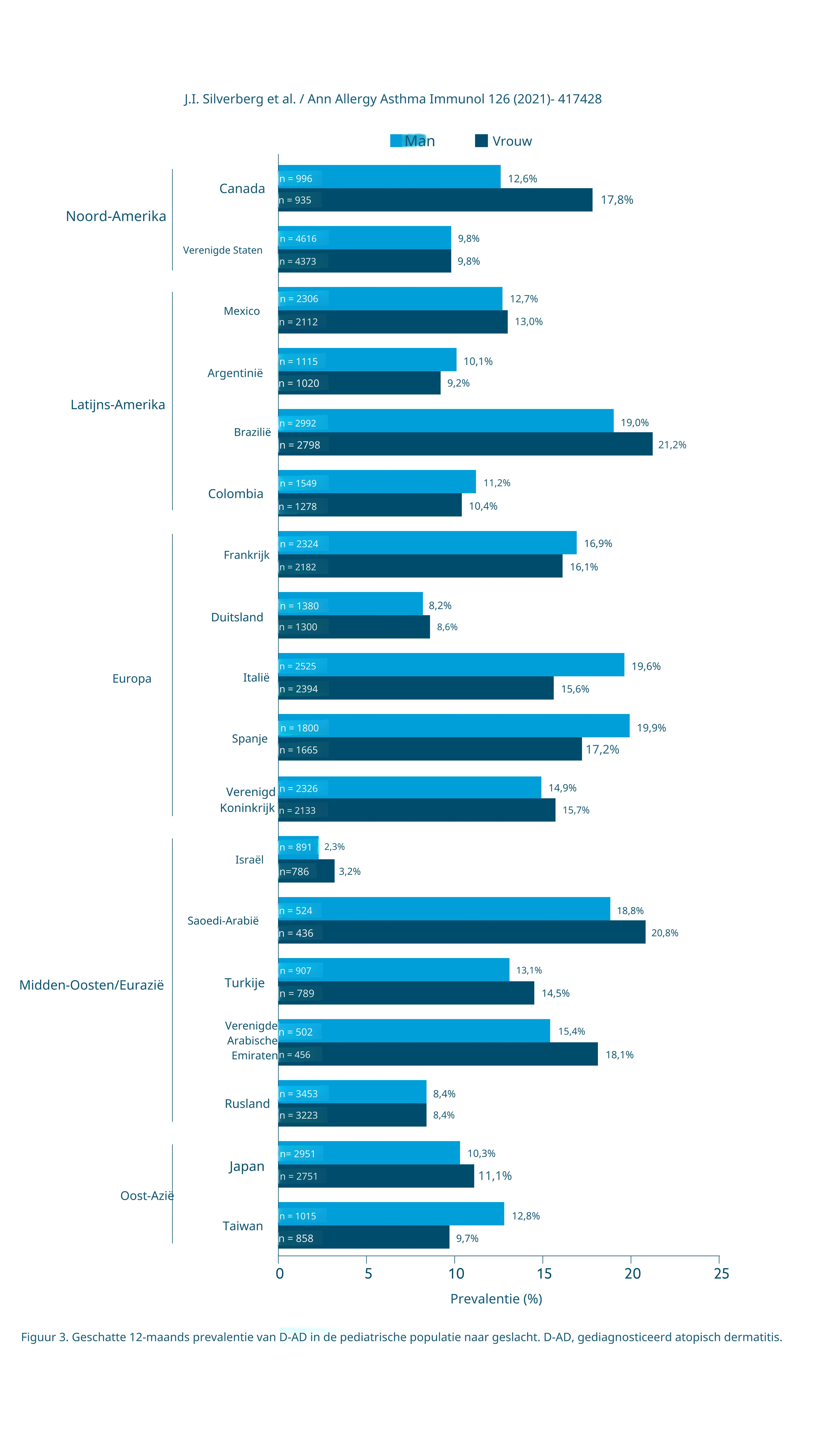 Methoden: Deze internationale, cross-sectionele online enquête werd uitgevoerd onder kinderen en adolescenten (van 6 maanden tot en met 18 jaar) in de volgende 18 landen: Noord-Amerika (Canada, Verenigde Staten), Latijns-Amerika (Argentinië, Brazilië, Colombia, Mexico), Europa (Frankrijk, Duitsland, Italië, Spanje, Verenigd Koninkrijk), Midden-Oosten en Eurazië (Israël, Saoedi-Arabië, Turkije, Verenigde Arabische Emiraten, Rusland) en Oost-Azië (Japan, Taiwan). De prevalentie werd bepaald aan de hand van twee definities: (1) diagnose van atopische dermatitis (AD) volgens de criteria van de International Study of Asthma and Allergy in Children (ISAAC) en melding door het kind of de ouders van een eerdere diagnose van AD (eczeem) door een arts; en (2) melding van AD uitsluitend op basis van de ISAAC-criteria. De ernst werd beoordeeld met behulp van de Global Patient Assessment (GPA) en de Patient-Centered Eczema Scale (POEM).