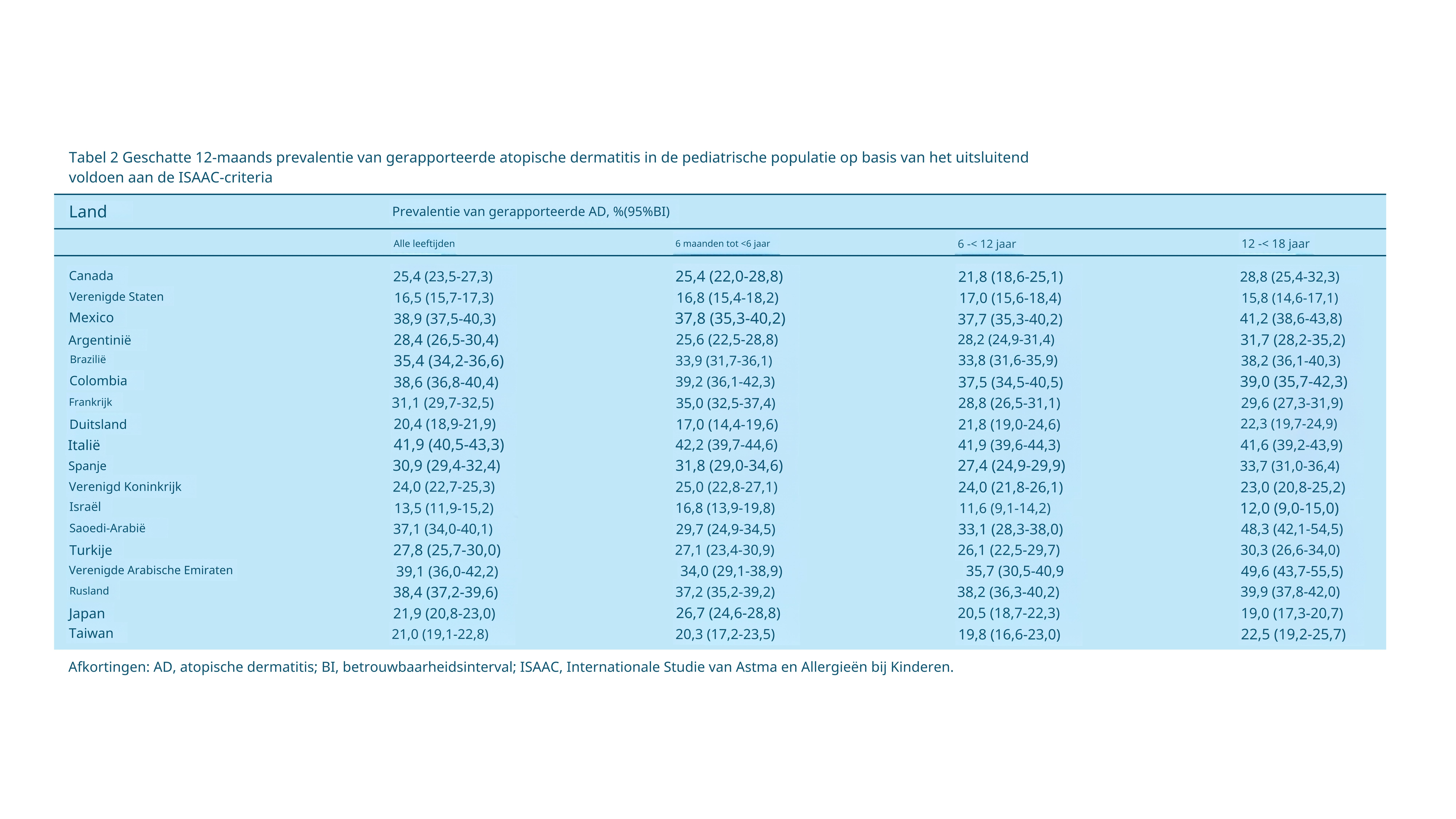 De prevalentie van atopische dermatitis (AD), gedefinieerd door de gelijktijdige aanwezigheid van de ISAAC-criteria en een diagnose van eczeem door een arts, was consequent lager dan de prevalentie van atopische dermatitis (AD) die werd gerapporteerd op basis van de ISAAC-criteria alleen. De hoge prevalentiecijfers die werden waargenomen op basis van zelfrapportage van symptomen door patiënten met behulp van de ISAAC-criteria alleen, kunnen het gevolg zijn van een verkeerde diagnose van aandoeningen die ook gepaard gaan met symptomatische jeuk en huidplooien bij kinderen aantasten. Gezien de lage positief voorspellende waarde van criteria die vergelijkbaar zijn met de ISAAC- criteria, kunnen vals-positieve resultaten, althans gedeeltelijk, bijdragen aan de hogere percentages die worden waargenomen wanneer de ISAAC-criteria alleen worden gebruikt; het combineren van de ISAAC-criteria met een medische diagnose zou deze beperking kunnen verhelpen. Bovendien maakt de prevalentie van AD een schatting mogelijk van de populatie die een arts raadpleegt voor deze aandoening. AD weerspiegelt dus waarschijnlijk een ernstiger vorm van de ziekte, zoals blijkt uit het hogere percentage personen met matige tot ernstige AD in vergelijking met de populatie met een verklaarde AD.