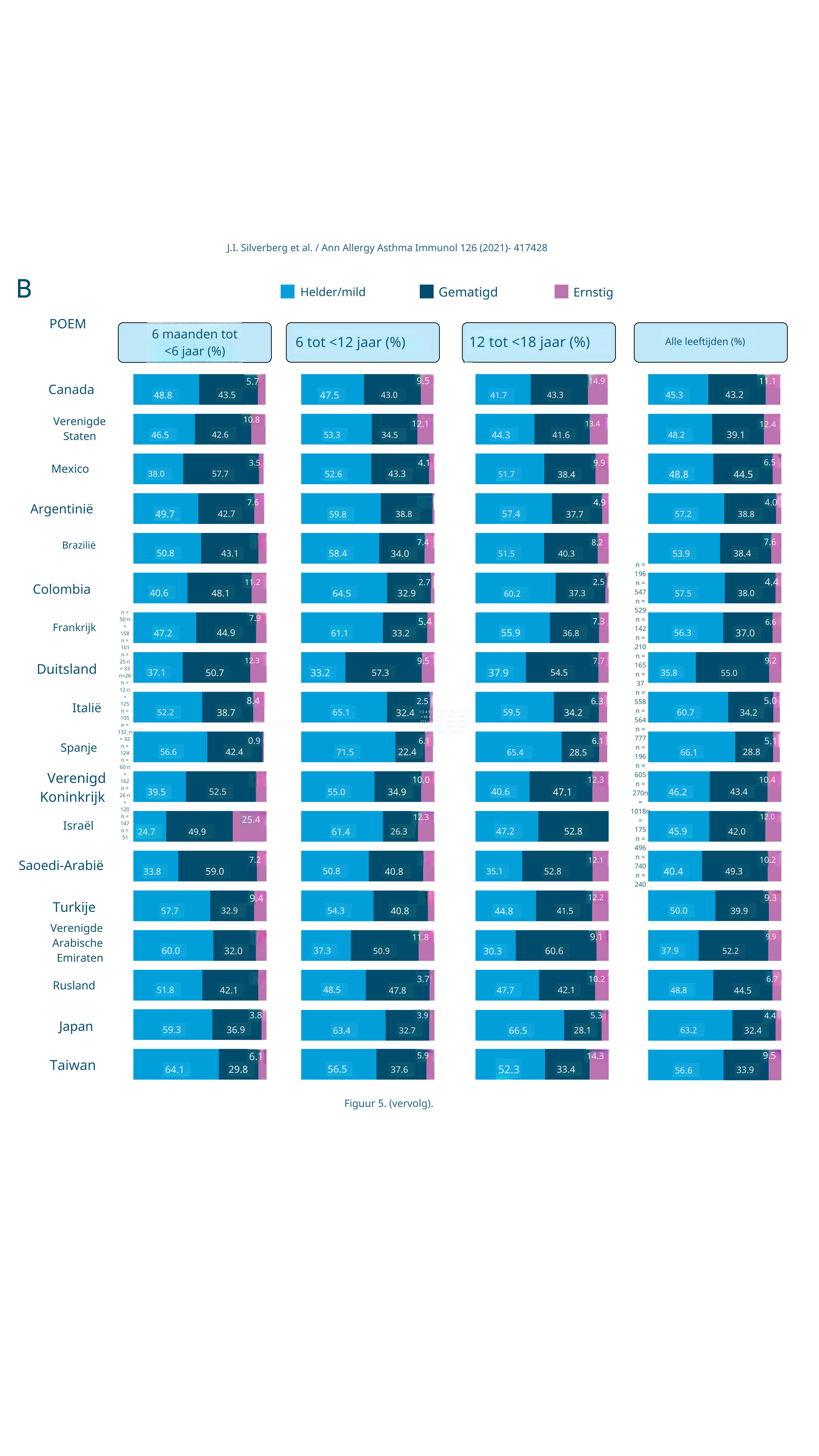 Figuur 5 toont de verdeling van de ernst van DAD, beoordeeld met behulp van de PtGA-schaal (Figuur 5A) en de POEM-schaal (Figuur 5B). Onder personen met DAD was het percentage ernstige vormen laag in alle leeftijdsgroepen en in alle landen, ongeacht de gebruikte ernstmaatstaf. Het percentage ernstige DAD varieerde van 0,9% tot 14,9%, behalve in Israël, waar het ongeveer 25% was bij jonge kinderen, ongeacht de gebruikte maatstaf, en 25,2% bij adolescenten volgens de PtGA-schaal. De steekproefomvang voor deze leeftijdsgroepen was echter klein vanwege de lage algehele prevalentie van DAD in Israël. Rekening houdend met de gecombineerde leeftijdsgroepen, varieerde milde D-AD van 43,4% (Israël) tot 72,3% (Zuid-Afrika en Japan) op de PtGA en van 35,8% (Duitsland) tot 66,1% (Spanje) op de POEM, terwijl matige AD varieerde van 24,0% (Zuid-Afrika) tot 47,5% (Rusland) en van 28,8% (Spanje) tot 55,0% (Duitsland) op de twee schalen (Fig. 5).