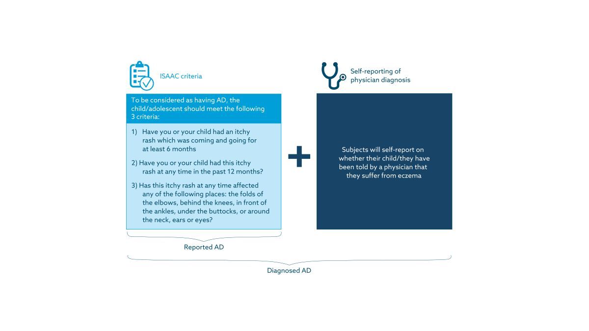 Afkortingen: AD, atopische dermatitis; ISAAC, International Study of Asthma and Allergies in Childhood; POEM, Patient-Oriented Eczema Measure; PtGA, Patient Global Assessment.