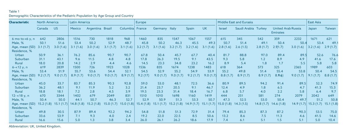 De populatie bestond uit 65.661 kinderen; 21.331 jonge kinderen van 6 maanden tot en met 6 jaar, 22.238 kinderen van 6 tot en met 12 jaar en 22.092 adolescenten van 12 tot en met 18 jaar. De demografische kenmerken (Tabel 1) waren representatief voor de afzonderlijke landen; de regionale verdeling binnen elk land was eveneens representatief (gegevens niet weergegeven). De woonomgeving leek echter voornamelijk te worden bepaald door stedelijke of voorstedelijke bevolkingsgroepen, hoewel er in Noord-Amerikaanse en Europese landen ook een aanzienlijk aantal plattelandsbewoners woonde (Tabel 1).