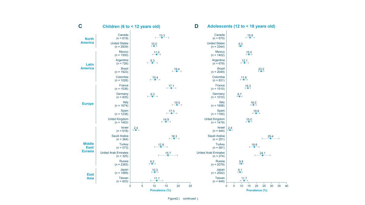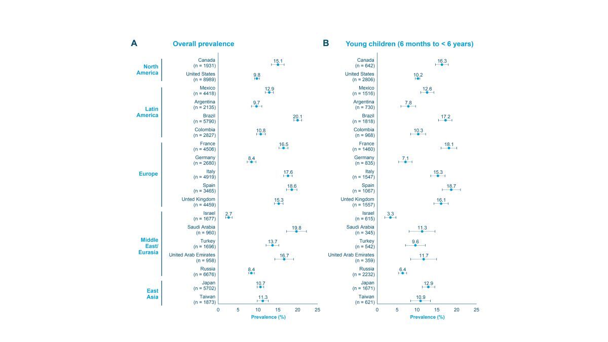 De totale prevalentie van D-AD was 12,1% onder kinderen van 6 maanden tot en met 6 jaar, 13,0% onder kinderen van 6 tot en met 12 jaar en 14,8% onder kinderen van 12 tot en met 18 jaar. Er werd geen algemeen patroon waargenomen op basis van leeftijdsgroepen (Figuur 2B-D), waarbij de prevalentie van D-AD varieerde van 3,3% (Israël) tot 18,7% (Spanje) onder jonge kinderen van 6 maanden tot en met 6 jaar, van 2,4% (Israël) tot 19,5% (Italië) onder kinderen van 6 tot en met 12 jaar en van 2,4% (Israël) tot 29,4% (Zuid-Afrika) onder adolescenten. Hoewel de prevalentie van D-AD over het algemeen vergelijkbaar was in de verschillende leeftijdsgroepen binnen elk land, vormde Zuid-Afrika een uitzondering. Daar was de prevalentie onder kinderen van 6 maanden tot en met 6 jaar (11,3%) relatief lager dan in de leeftijdsgroepen van 6 tot en met 12 jaar (18,3%) en 12 tot en met 18 jaar (29,4%). Daarnaast werden er incrementele verschillen in prevalentie van de jongste naar de oudste leeftijdsgroepen waargenomen voor Brazilië (17,2%, 19,4% en 23,2%), Turkije (9,6%, 12,8% en 18,6%) en de Verenigde Arabische Emiraten (11,7%, 15,7% en 24,1%). Israël had consequent de laagste D-AD-prevalentie, die stabiel bleef in alle leeftijdsgroepen. Van de Europese landen had Duitsland de laagste prevalentie, ongeacht de leeftijd, en van de Latijns-Amerikaanse landen had Brazilië de hoogste prevalentie in alle leeftijdsgroepen.