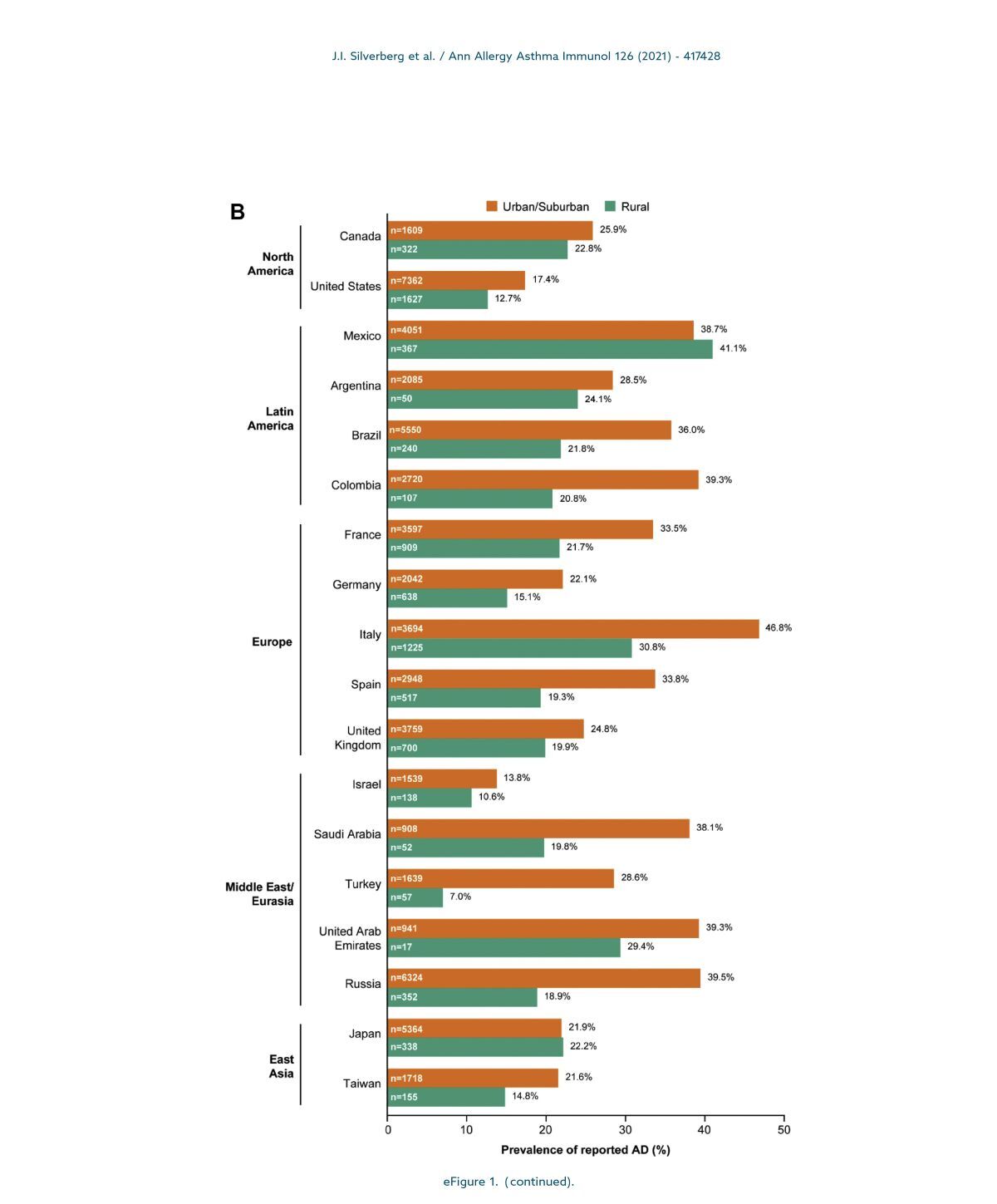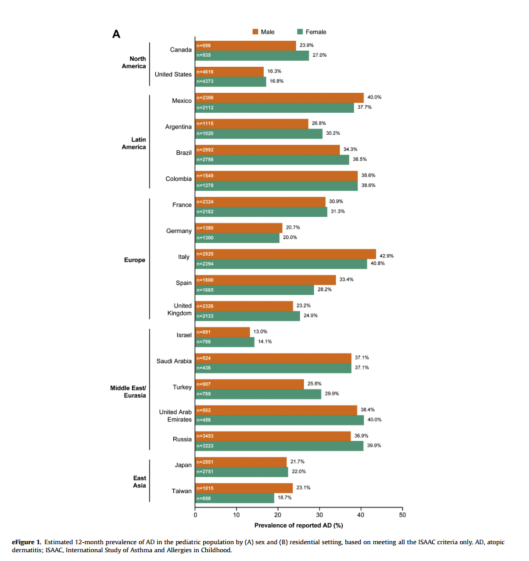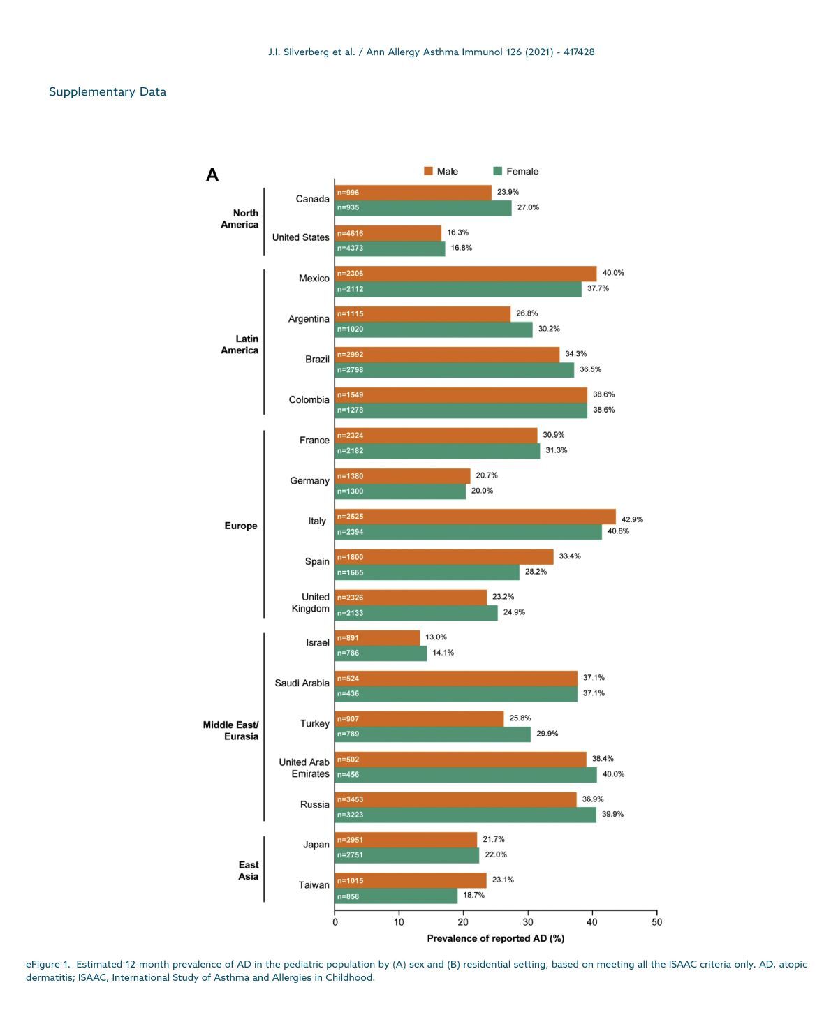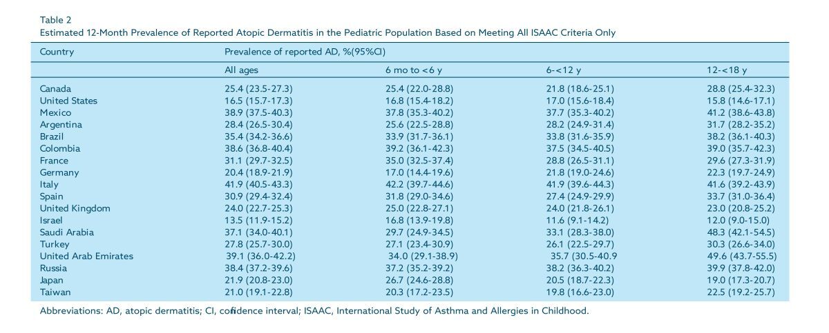De resultaten van deze studie tonen een grote variatie in de algehele prevalentie van D-AD over een periode van 12 maanden bij kinderen en adolescenten, met de laagste prevalentie in Israël (2,7%) en de hoogste in Brazilië (20,1%), op de voet gevolgd door Zuid-Afrika (19,8%). Deze variabiliteit kan mogelijk worden verklaard door gerapporteerde verschillen in het begin en de persistentie van de ziekte, de presentatie en de diagnose, die voortkomen uit de fenotypische heterogeniteit van AD in verschillende etnische en raciale populaties.21-24 Het is ook mogelijk dat een deel van deze variabiliteit kan worden verklaard door culturele verschillen in de antwoorden op de enquête of door discrepanties tussen symptomen en de diagnose van de arts, die het gevolg kunnen zijn van verschillen in toegang tot de gezondheidszorg.