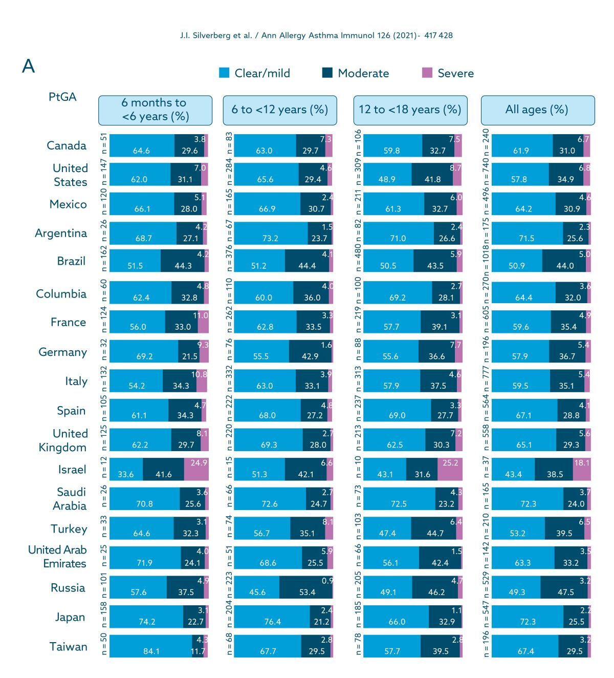 Methoden: Deze internationale, cross-sectionele, webgebaseerde enquête onder kinderen en adolescenten (6 maanden tot <18 jaar) werd uitgevoerd in de volgende 18 landen: Noord-Amerika (Canada, Verenigde Staten), Latijns-Amerika (Argentinië, Brazilië, Colombia, Mexico), Europa (Frankrijk, Duitsland, Italië, Spanje, Verenigd Koninkrijk), Midden-Oosten en Eurazië (Israël, Saoedi-Arabië, Turkije, Verenigde Arabische Emiraten, Rusland) en Oost-Azië (Japan, Taiwan). De prevalentie werd bepaald aan de hand van de volgende twee definities: (1) gediagnosticeerd met atopische dermatitis (AD) volgens de criteria van de International Study of Asthma and Allergies in Childhood (ISAAC) en zelfrapportage of rapportage door ouders dat een arts hen of hun kind ooit heeft verteld dat zij AD (eczeem) hadden; en (2) gerapporteerde AD uitsluitend op basis van de ISAAC-criteria. De ernst werd beoordeeld met behulp van de Patient Global Assessment (PtGA) en de PatientOriented Eczema Measure (POEM).