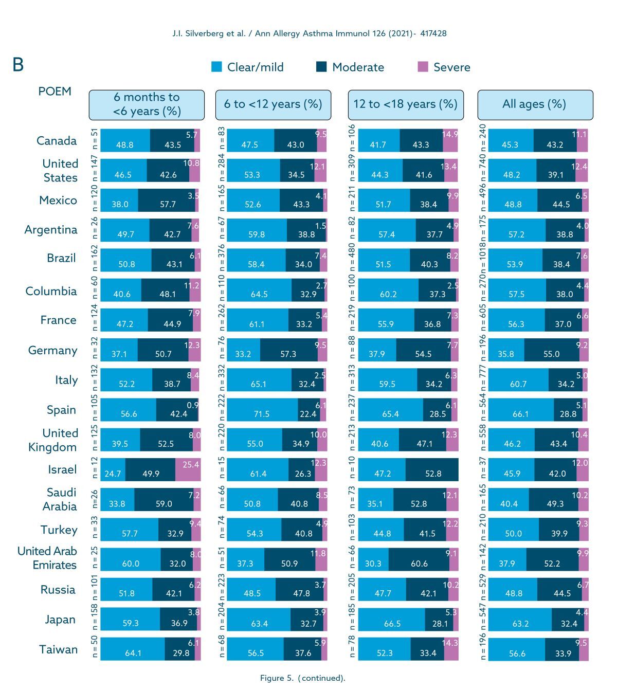 Figuur 5 toont de verdeling van de ernst van D-AD, geëvalueerd met behulp van PtGA (Fig. 5A) en POEM (Fig. 5B). Onder de proefpersonen met D-AD was het percentage met een ernstige vorm van de ziekte laag in alle leeftijdsgroepen en in alle landen, ongeacht welke maatstaf voor de ernst werd gebruikt. Het percentage ernstige D-AD varieerde van 0,9% tot 14,9%, behalve in Israël, waar het percentage ongeveer 25% was onder jonge kinderen, ongeacht de gebruikte maatstaf, en 25,2% onder adolescenten op basis van PtGA. De steekproefomvang voor deze leeftijdsgroepen was echter klein vanwege de lage algehele prevalentie van D-AD in Israël. Rekening houdend met de gecombineerde leeftijdsgroepen, varieerde milde D-AD van 43,4% (Israël) tot 72,3% (Zuid-Afrika en Japan) op de PtGA en van 35,8% (Duitsland) tot 66,1% (Spanje) op de POEM, terwijl matige AD varieerde van 24,0% (Zuid-Afrika) tot 47,5% (Rusland) en van 28,8% (Spanje) tot 55,0% (Duitsland) op de twee schalen (Figuur 5).