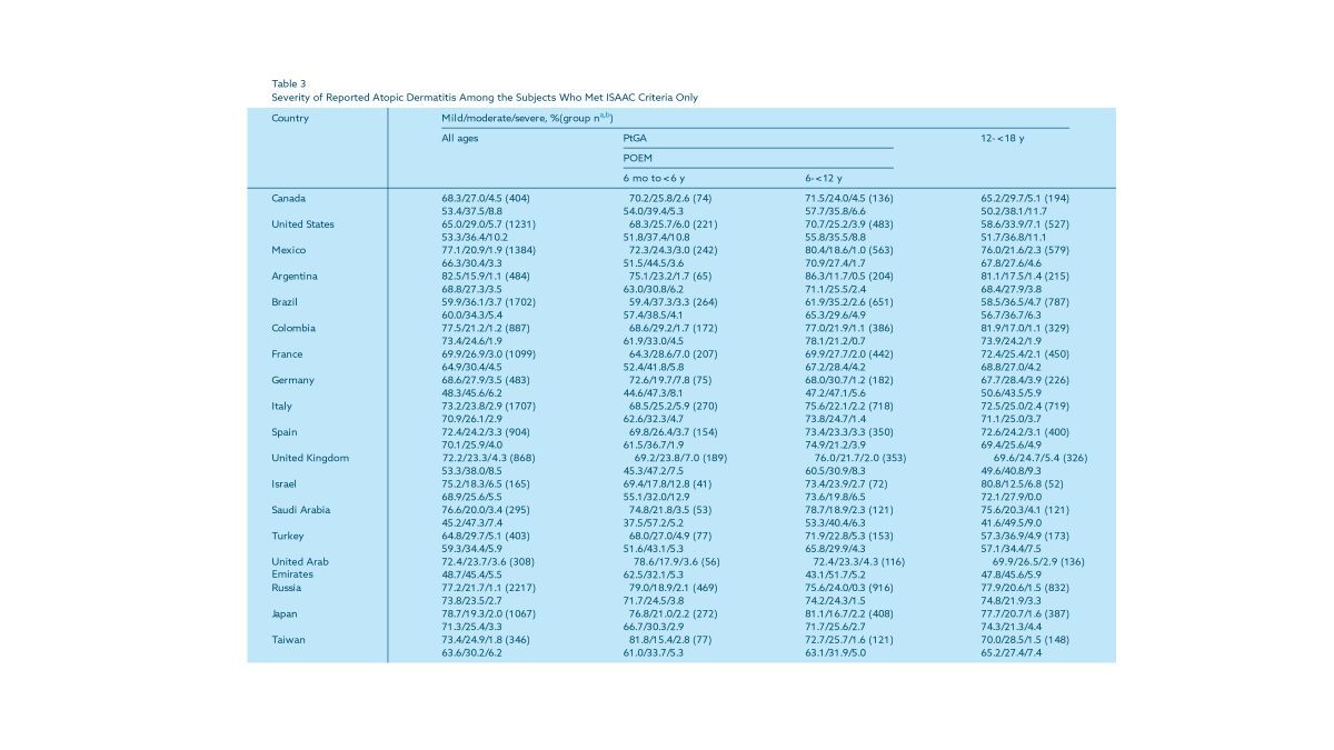 In tegenstelling tot de ISAAC-studie, 6 karakteriseerde de huidige studie de prevalentie bij kinderen aan de hand van brede leeftijdsgroepen, waaronder jonge kinderen (6 maanden tot <6 jaar oud), en de ernst van de ziekte, waarbij gebruik werd gemaakt van demografische quota om representatieve populaties van de afzonderlijke landen te evalueren. De grote variatie tussen plattelands- en stedelijke of voorstedelijke populaties suggereert echter dat de populaties, in ieder geval voor sommige landen, mogelijk voornamelijk representatief waren voor de stedelijke omgeving.