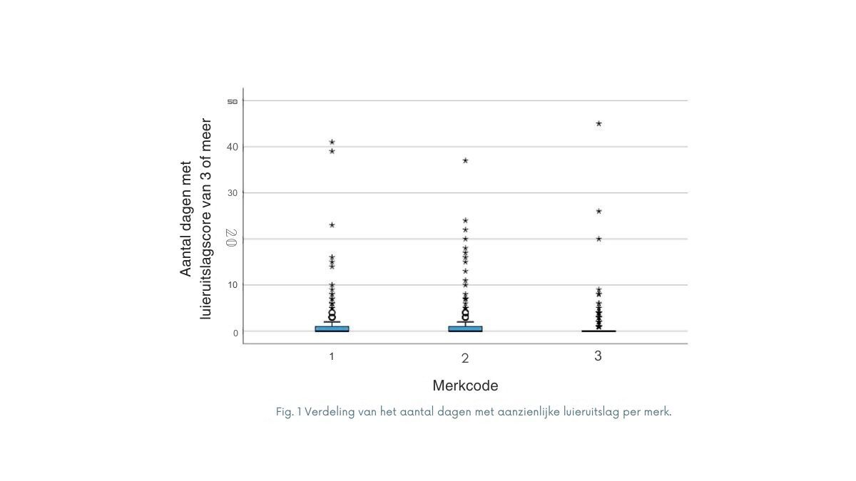 Het percentage moeders dat minstens één dag klinisch significante luieruitslag (graad 3 of hoger) meldde, was 24,6%. Merk 3 had het laagste percentage baby's met significante luieruitslag (n = 46; 19%), gevolgd door merk 1 (n = 59; 25%) en merk 2 (n = 67; 30%). De verdeling van het aantal dagen met significante luieruitslag per merk is weergegeven in figuur 1. Ernstige luieruitslag (graad 4 en 5) kwam zelden voor (2,4% van de baby's). Er werden geen problemen gemeld, zoals allergische reacties die medische aandacht vereisten. Over het algemeen was de gemiddelde luieruitslagscore 1,43 en het gemiddelde aantal dagen zonder luieruitslag was 34 van de 55 dagen in het onderzoek.