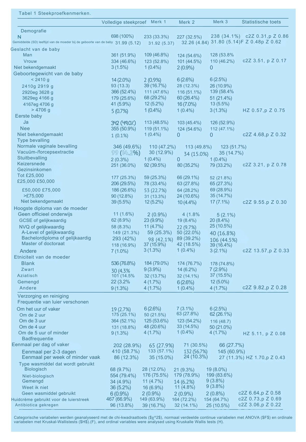 Graad 2: lichte roodheid en uitslag; graad 3: het punt waarop gebarsten huid en ongemak duidelijk zichtbaar zijn; en graad 4 en 5: ernstiger (bijlage). De uitkomst "klinisch significante intieme hygiëneziekte" werd gedefinieerd als graad 3 of hoger. De gegevens werden geanalyseerd met behulp van SPSS en Stata. Univariate vergelijkingen tussen merken vochtige doekjes en kenmerken van de steekproef werden uitgevoerd met behulp van ANOVA, chi-kwadraat en Kruskal-Wallis-toetsen, afhankelijk van het type variabele. Analyses van het effect van merk op de incidentie van intieme hygiëneziekte maakten gebruik van een gegeneraliseerd negatief binomiaal lineair model met een logaritmische linkfunctie, waarbij werd gecorrigeerd voor potentiële confounders bij aanvang. 16