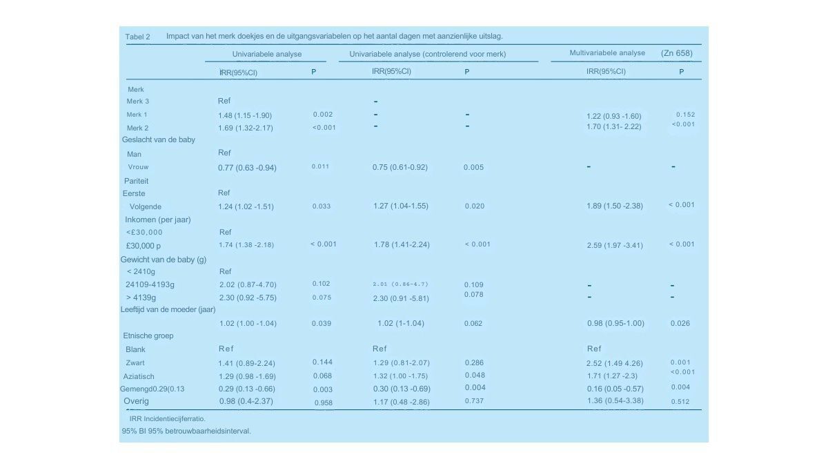Een univariate analyse (Tabel 2) van klinisch significante IDD toonde een zeer significant merkeffect aan. Voor één dag klinisch significante luieruitslag met merk 3 zou de uitslag 1,48 dagen (95% CI: 1,15–1,90) hebben geduurd met merk 1 (p < 0,002) en 1,69 dagen (95% CI: 1,32–2,17) met merk 2 (p < 0,001). Andere potentiële factoren waren het geslacht van de baby (meisjes hadden een lagere incidentie van uitslag, incidentieratio [IRR] 0,77, 95% CI: 0,63–0,94, p < 0,011) en pariteit (tweede of volgende baby's hadden een hogere incidentie: IRR 1,24, 95% CI: 1,04–1,51, p < 0,033). Elk extra jaar dat de moeder ouder werd, ging gepaard met een 1,02-voudige toename (95% CI: 1,00–1,04) van het aantal ernstige luieruitslaggevallen (p < 0,039). Moeders met een bovengemiddeld jaarinkomen (>£30.000) hadden een hoger percentage luieruitslag dan moeders met een ondergemiddeld inkomen (IRR 1,74, 95% CI: 1,38–2,18, p < 0,001). Baby's van moeders met een gemengde etnische achtergrond hadden een lager percentage luieruitslag (IRR 0,29, 95% CI: 0,13–0,66, p < 0,003) vergeleken met baby's van witte moeders.