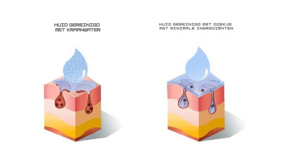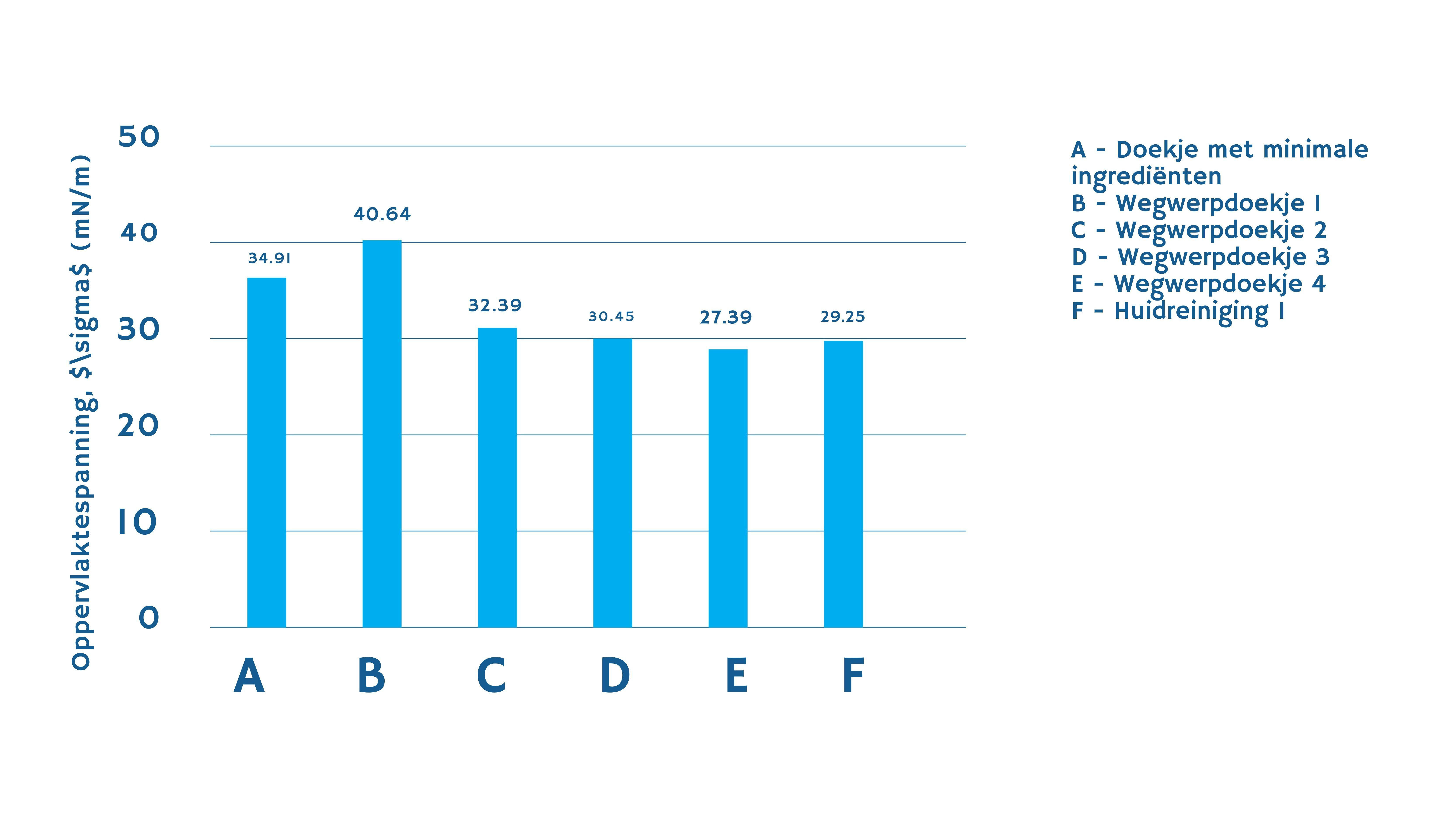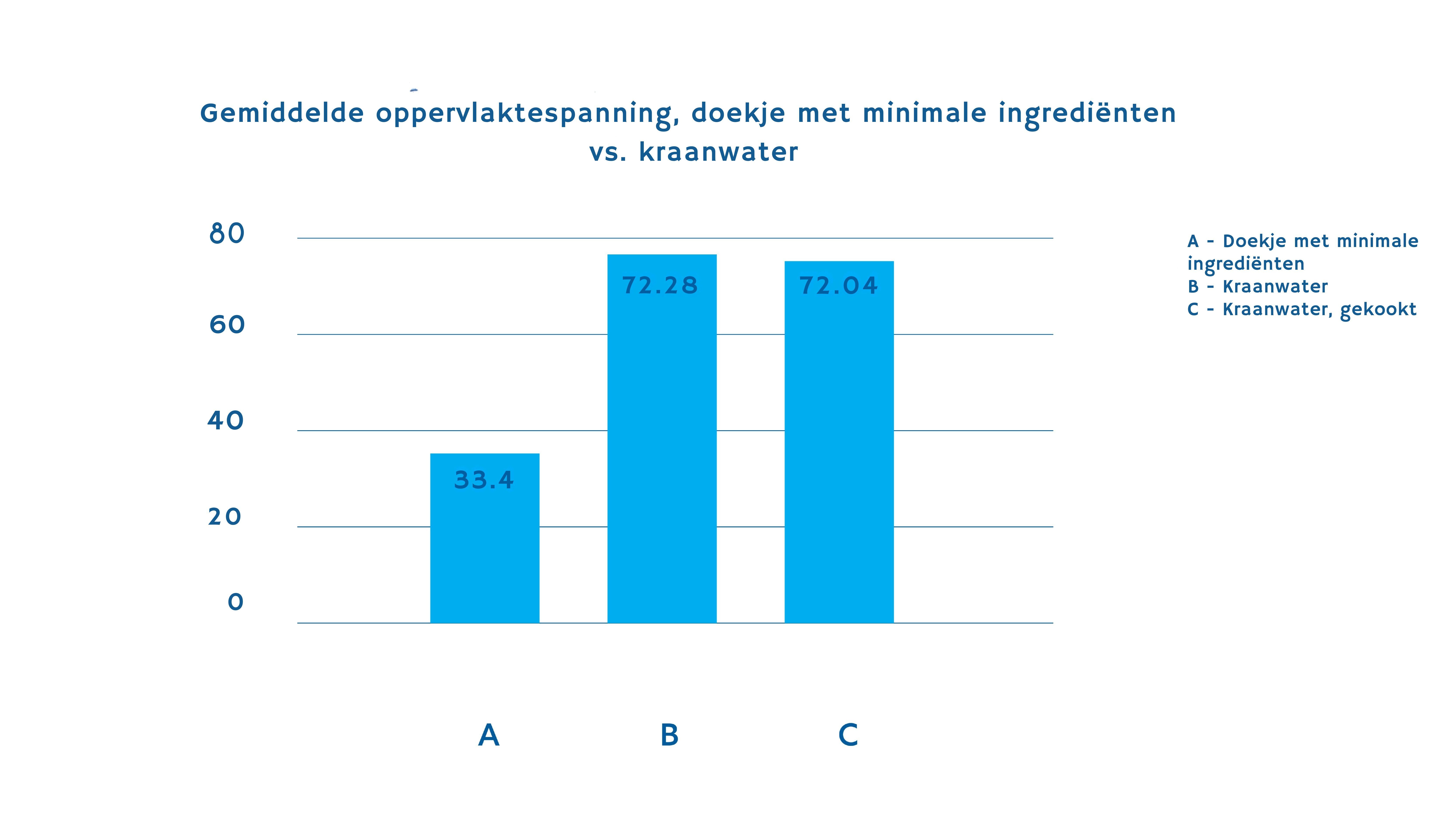 Om de huid effectief te reinigen, moet de vloeibare component van reinigingsdoekjes een lage oppervlaktespanning hebben (Corazza, Lauriola et al. 2010, Liu 2020). Hoe lager de oppervlaktespanning, hoe gemakkelijker de vloeistof zich over de huid verspreidt en dieper in poriën en huidplooien doordringt om onzuiverheden en vuil op te vangen, waardoor de verwijdering ervan wordt vergemakkelijkt (Liu 2020). Om de oppervlaktespanning te verlagen, bevatten de meeste commercieel verkrijgbare reinigingsdoekjes oppervlakteactieve stoffen en diverse andere additieven (Liu 2020). Deze verlagen de oppervlaktespanning effectief tot minder dan 40 mN/m, waardoor onzuiverheden en vuil efficiënter worden verwijderd dan met afgekoeld gekookt water, dat doorgaans een oppervlaktespanning heeft van meer dan 70 mN/m. Deze stoffen kunnen echter droogheid, jeuk, irritatie en ontstekingen veroorzaken, die kunnen verergeren als er na gebruik resten van deze stoffen op de huid achterblijven (Aschenbeck en Warshaw 2017, Liu 2020). Bij een rijpere huid kunnen deze nadelige effecten ernstige gevolgen hebben als de huid barst en geïnfecteerd raakt (Surber, Brandt et al. 2015).