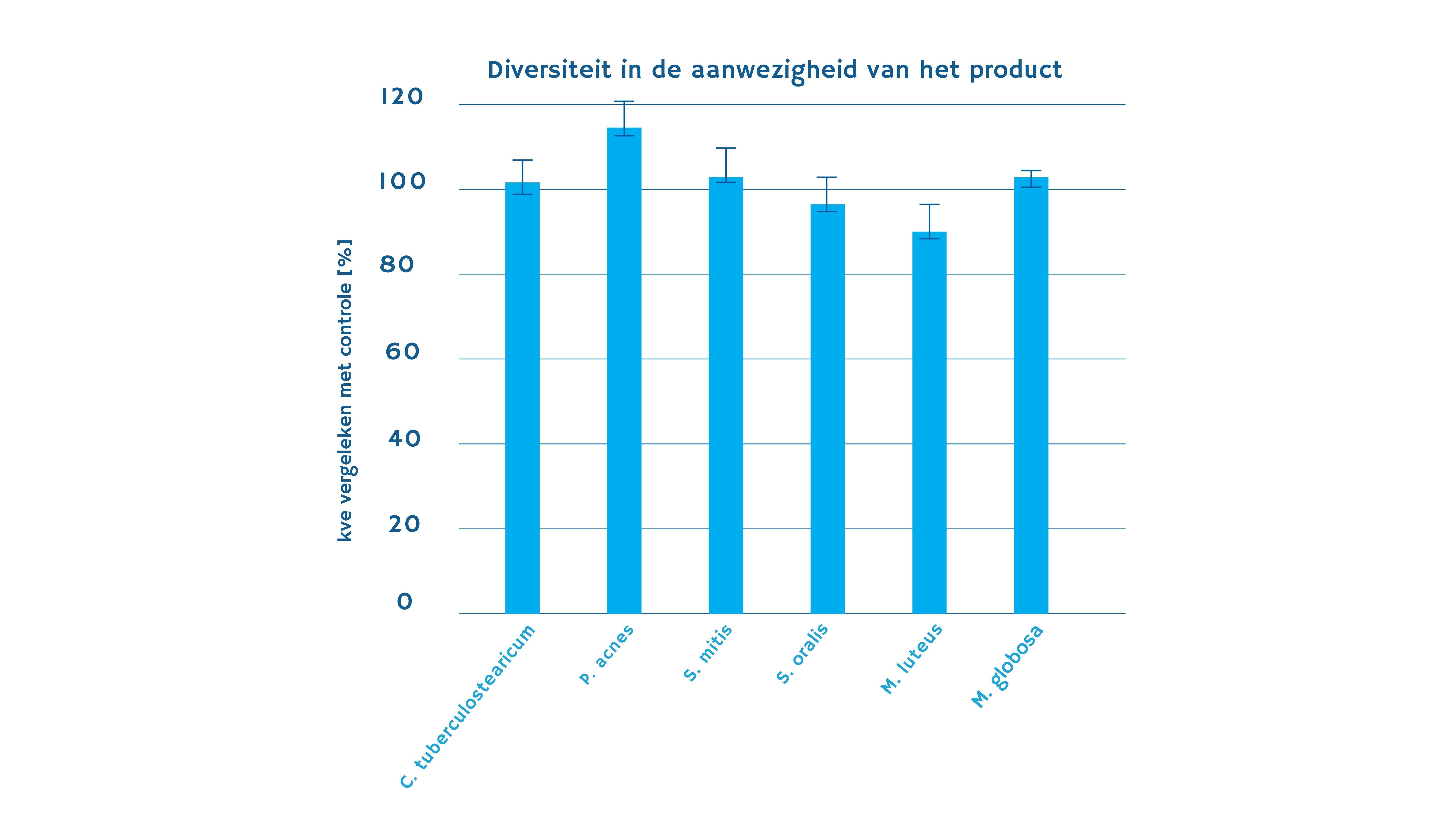 Het is ook aangetoond dat reinigingsdoekjes met minimale ingrediënten de integriteit van de commensale huidflora behouden. Een gezonde huid wordt gekoloniseerd door een diverse gemeenschap van micro-organismen, waaronder bacteriën, schimmels en virussen, die samen de huidflora vormen. Deze micro-organismen creëren een dynamisch ecosysteem dat een beschermende barrière vormt tegen pathogenen, helpt bij het reguleren van immuunreacties en de homeostase van de huid bevordert. De microbiota concurreert met pathogene micro-organismen om ruimte en voedingsstoffen, waardoor hun kolonisatie en de daaruit voortvloeiende infecties worden voorkomen (Grice en Segre, 2011). De bacterie Staphylococcus epidermidis produceert antimicrobiële peptiden (bacteriocinen) (Newstead, Varjonen et al., 2020) en draagt bij aan het behoud van de beschermende barrière van de huid (Zheng, Hunt et al., 2022), waardoor de proliferatie van pathogene bacteriën zoals Staphylococcus aureus wordt beperkt (Severn en Horswill, 2023). Bovendien draagt het behoud van de diversiteit van de commensale huidflora bij aan een optimale pool van beschermende soorten (Wallen-Russell 2019). Het behoud van de natuurlijke huidflora en het vermijden van het routinematig gebruik van additieven die de commensale microbiota kunnen elimineren, kan infecties helpen voorkomen (Harris-Ray 2022). Een reeks certificeringsexperimenten (Figuur 2) toonde aan dat minimaal invasieve doekjes de balans tussen *S. epidermidis* en *S. aureus* op de huid, noch de diversiteit van de microbiota beïnvloeden. (Ongepubliceerde gegevens)