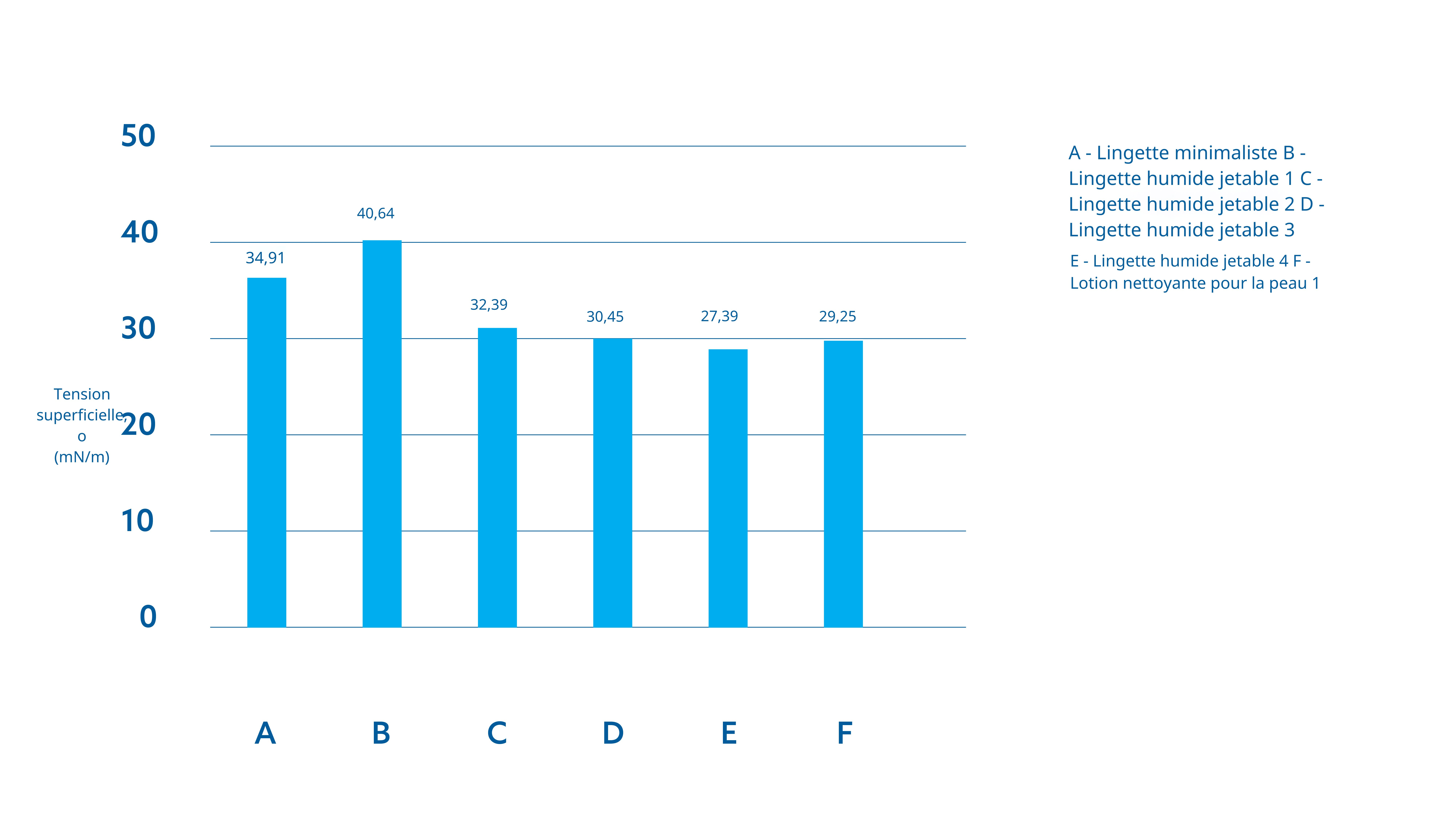La lingette sans détergent ou à formulation minimale présente une faible tension superficielle, comparable à celle des lingettes contenant des tensioactifs et inférieure à celle de l'eau du robinet bouillie, comme le démontrent les tests en laboratoire (Figure 1). Ce résultat est obtenu grâce à deux procédés : l'utilisation d'eau ultra-purifiée et l'ajout d'extrait de fruit. Le procédé exclusif d'ultra-purification de l'eau brute en sept étapes (combinant décontamination, filtration et adoucissement, avec ajout d'extrait de fruit) permet d'obtenir un liquide final à faible tension superficielle (< 35 mN/m), comparable à celle des lingettes contenant des additifs ou des tensioactifs, et nettement inférieure à celle de l'eau du robinet bouillie (> 70 mN/m) (Figure 1.b). (Données non publiées)