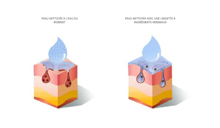 Pour nettoyer efficacement la peau, la composante liquide des lingettes doit présenter une faible tension superficielle (Corazza, Lauriola et al. 2010, Liu 2020). Plus la tension superficielle est faible, plus le liquide s'étale facilement sur la peau et pénètre profondément dans les pores et les plis cutanés pour piéger les impuretés et les débris, facilitant ainsi leur élimination (Liu 2020). Afin de réduire la tension superficielle, la plupart des lingettes disponibles dans le commerce contiennent des tensioactifs et divers autres additifs (Liu 2020). Ces derniers abaissent efficacement la tension superficielle à moins de 40 mN/m, permettant une élimination plus efficace des impuretés et des débris que l'eau bouillie refroidie, dont la tension superficielle est généralement supérieure à 70 mN/m. Cependant, ces composés peuvent provoquer sécheresse, démangeaisons, irritations et inflammations, qui peuvent être exacerbées si des résidus contenant ces composés persistent sur la peau après utilisation (Aschenbeck et Warshaw 2017, Liu 2020). Sur une peau mature, ces effets indésirables peuvent avoir de graves conséquences si la peau se fissure et s'infecte (Surber, Brandt et al. 2015).