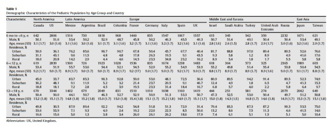 The population consisted of 65,661 pediatric subjects; 21,331 young children aged 6 months to less than 6 years, 22,238 children aged 6 to less than 12 years, and 22,092 adolescents aged 12 to less than 18 years. The demographic characteristics (Table 1) were representative of the individual countries; the regional distributions within each country were also representative (data not shown). However, residential settings seemed to be primarily driven by urban or suburban populations, although rural populations were substantial in North American and European countries (Table 1).