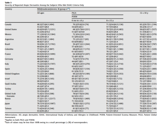 In conclusion, this population-based study using validated methods revealed that the 12-month prevalence of pediatric AD is higher than that reported for adult AD and displays a high variability across countries even within geographic regions. Unlike adult AD, there did not seem to be a clear association of AD with sex; prevalence among males and females varied by country. Although small differences in severity distribution were observed across age groups and countries, severe AD represented a consistently small proportion of the overall pediatric AD population (<15%). These country-level data on AD prevalence and severity may be useful in the development of public health management strategies including allocation of budgets and resources. However, these results also underscore the need for a better understanding of the factors that contribute to the observed differences across countries and regions and may provide the basis for hypothesis-driven studies to characterize these factors such as potential interactions between environment and genetics.