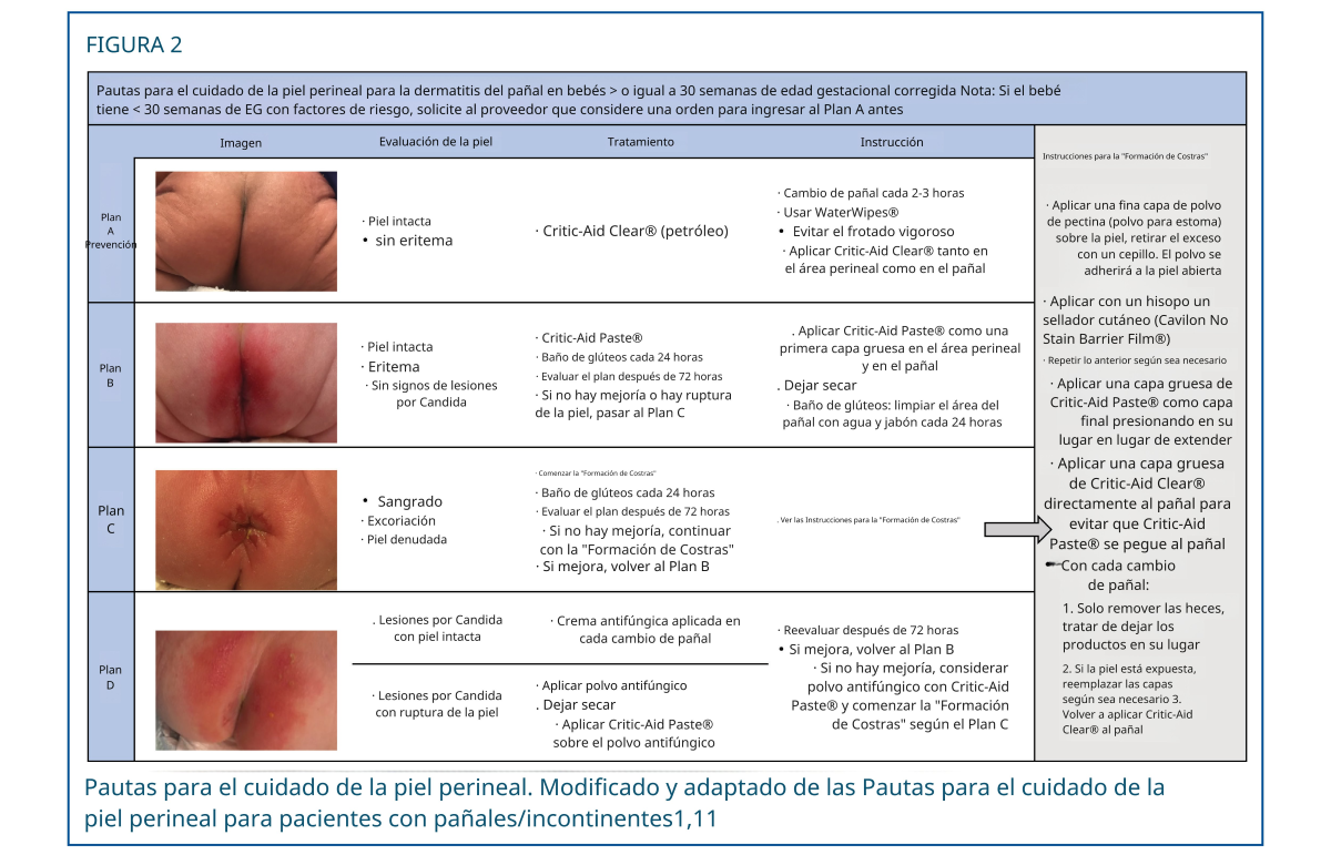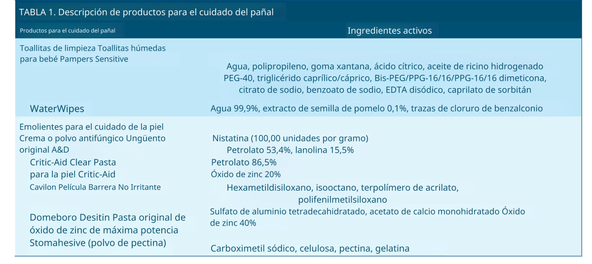 Una evaluación de la piel intacta no eritematosa describió la ausencia de dermatitis del pañal (DP), en cuyo caso el plan objetivo era la prevención (plan A: Prevención). El plan A establecía el uso de emolientes a base de petróleo (CriticAid Clear, [Coloplat Corporation, Minneapolis, Minnesota]) como capas protectoras de la piel. Era la primera línea de barrera para toda la piel intacta incluso antes de que se desarrollara la DP. La DP leve se describiría como piel intacta eritematosa sin signos de lesiones por Candida. Las guías detallaban los tratamientos para la DP leve en el plan B, en el que se aplicaba una capa con emolientes que contenían óxido de zinc (Critic-Aid Paste, [Coloplat Corporation, Minneapolis, Minnesota]) en la zona afectada. Un lactante con DP recibiría un baño de agua y jabón alrededor del área del pañal cada 24 horas para eliminar suavemente los irritantes. El plan de tratamiento C se asignó para la DP grave, en la que había piel eritematosa, denudada, excoriada o sangrante sin lesiones por Candida. El plan C consistía en una técnica de formación de costras mediante la aplicación de polvo de pectina (Stomahesive Protective Powder, [Convatec, Oklahoma City, OK]), sellador cutáneo (Cavilon No Stain Barrier Film, [3M, St. Paul, Minnesota]) y capas protectoras adicionales con emolientes. Las instrucciones del plan D se referían a infecciones cutáneas por hongos con lesiones por Candida, que requerían tratamiento antimicótico. Cuando la lesión cutánea mejoraba, se podía reducir la intensidad del tratamiento. La Tabla 1 enumera los ingredientes activos de los emolientes para el cuidado de la piel.