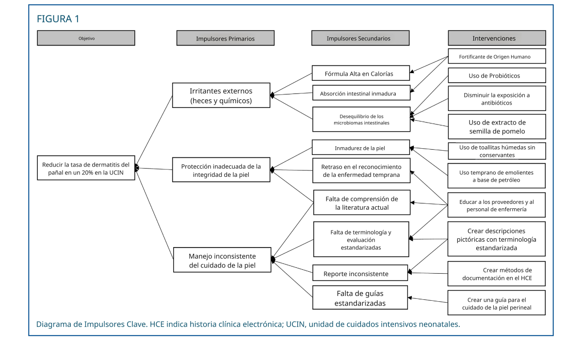 Utilizando la herramienta Diagrama de Factores Clave (Figura 1), el equipo identificó los factores de riesgo neonatales de DD y recopiló posibles intervenciones dirigidas a reducir la DD basándose en la revisión de la literatura, las opiniones de expertos y el consenso multidisciplinario. Uno de los factores de riesgo fueron los irritantes externos, incluidos los irritantes químicos y las heces. Nuestra UCIN había estado limitando la exposición a la fórmula y utilizando más leche humana donada y fortificantes a base de leche humana. También intentamos restaurar microbiomas intestinales saludables con la administración de probióticos y la disminución de la exposición a antibióticos, aunque la DD seguía siendo prevalente. El manejo inconsistente del cuidado de la piel y el uso inadecuado de la protección de la integridad de la piel del pañal también se identificaron como factores principales. Por lo tanto, el equipo desarrolló las Guías de Cuidado de la Piel Perineal para estandarizar la evaluación, la documentación, la prevención y el tratamiento de la piel (Figura 2). Las Guías de Práctica Clínica Basadas en la Evidencia para el Cuidado de la Piel Neonatal publicadas por AWHONN y las Guías de Cuidado de la Piel Perineal de Heimall para Pacientes con Pañales/Incontinentes sirvieron como marcos de diseño. 1,11 El objetivo del enunciado del proyecto de mejora de la calidad era reducir la tasa de DD en un 20% en la UCIN.