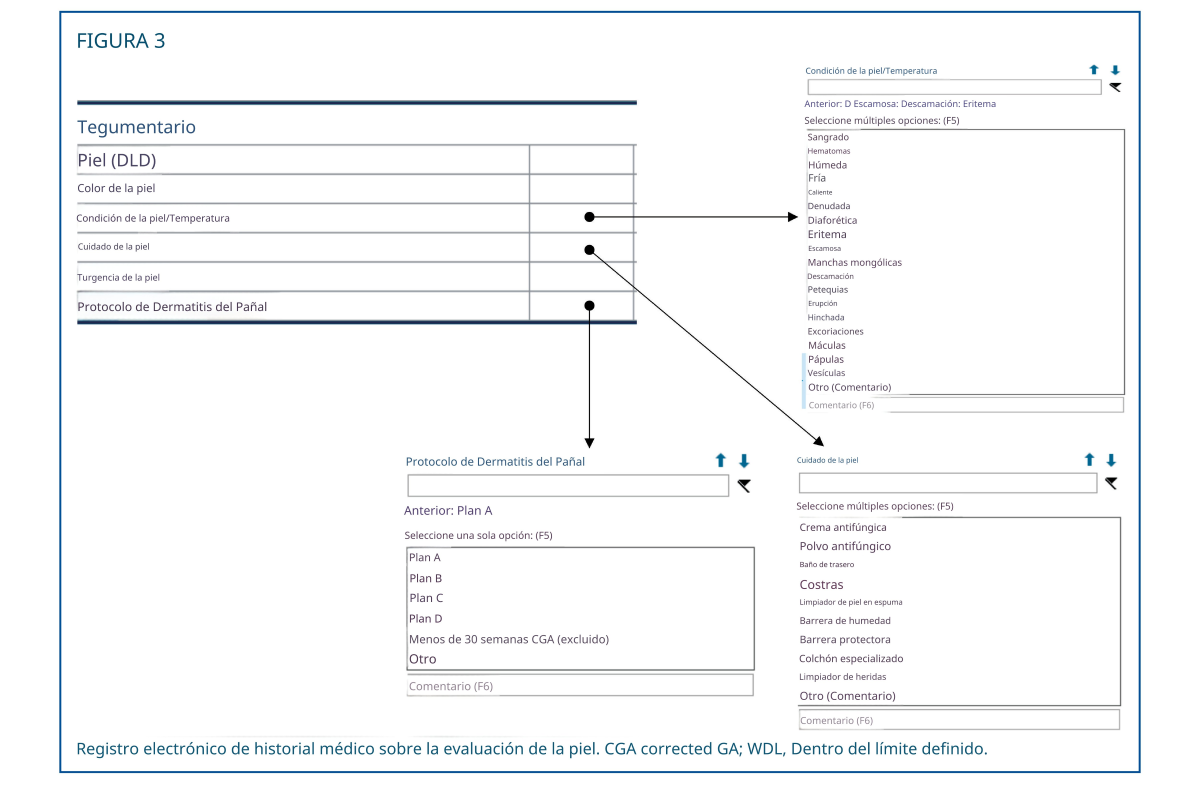 Los pasos iniciales consistieron en estandarizar la evaluación y documentación de la piel. El término "erupción" era inespecífico y no describía la gravedad de la enfermedad; sin embargo, se registraba comúnmente antes de la implementación de las Guías de Cuidado de la Piel Perineal. Se adaptó una tabla pictórica de guías publicadas previamente para categorizar la gravedad de la dermatitis de contacto. 1,11 La tabla asignaba terminología descriptiva a 4 niveles de gravedad y recomendaba planes de tratamiento específicos para cada uno (planes AD) (Figura 2). 1,11 Las enfermeras realizaban una evaluación de la piel con cada cambio de pañal y la documentaban con la terminología específica y descrita en la historia clínica electrónica (HCE). Para estandarizar un informe descriptivo en la HCE, las enfermeras seleccionaban de una lista de terminología sugerida que incluía erupción, eritema, sangrado, excoriación, denudación y/u otros (Figura 3).