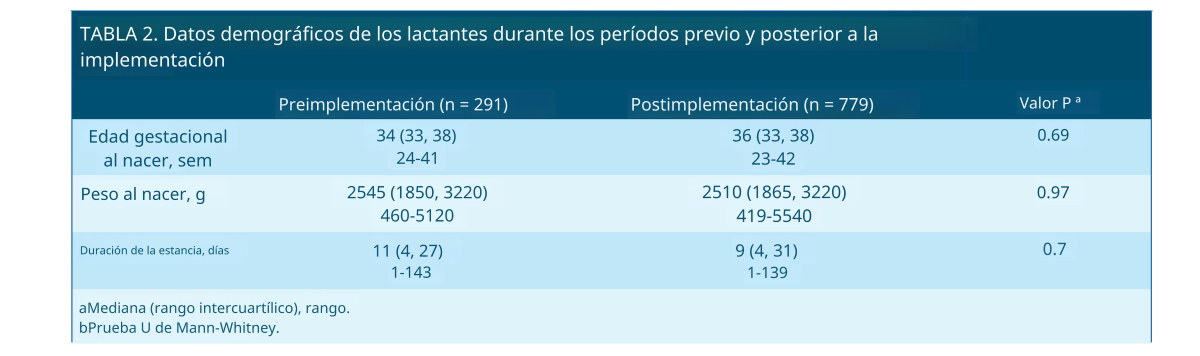 Durante el período de estudio entre julio de 2017 y marzo de 2019, 1280 lactantes fueron ingresados en la UCIN y 1070 de ellos permanecieron en la UCIN durante más de 1 día. No hubo diferencias significativas en la EG (P = 0,69), el PNB (P = 0,97) y la LOS (P = 0,70) entre los lactantes ingresados en los períodos preimplementación (julio de 2017 a diciembre de 2017) y postimplementación (enero de 2018 a marzo de 2019) (Tabla 2). La incidencia basal de DD fue del 46,0%. Los lactantes que nacieron con menos de 30 semanas de EG (n = 117) tuvieron una mayor incidencia de DD que los demás (67,6% frente a 37,4%, razón de riesgo: 3,05, IC del 95%: 2,10-4,45, P < 0,0001).
