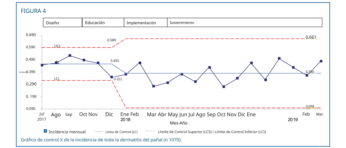 Métodos: Nuestra unidad revisó la literatura basada en la evidencia para desarrollar una guía estandarizada de cuidado perineal para la prevención y el tratamiento, que incluye el uso de toallitas húmedas para pañales novedosas, sin conservantes y con extracto de semilla de pomelo. Las medidas de resultado fueron la incidencia y la duración de la dermatitis del pañal. Se monitorizó el cumplimiento de los protocolos. La medida de control fue la tasa de infección cutánea por hongos durante el uso de las toallitas sin conservantes.