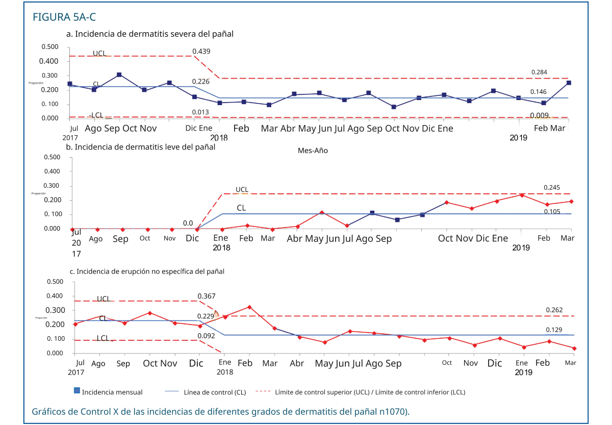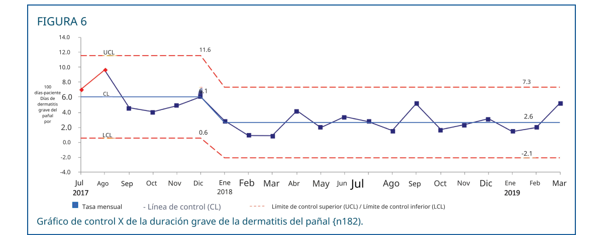Las medidas de resultado se analizaron con gráficos de control de procesos estadísticos (QI Macros para Excel, versión 2018, Denver, Colorado). Las tasas de incidencia mensuales de grados de DD se graficaron en gráficos X-mR. La duración de DD grave por cada 100 días-paciente también se graficaron en gráficos X-mR. Los límites de control se establecieron como líneas de ±3 sigma. La mediana y el rango intercuartil se utilizaron para describir GA, BW y LOS. La prueba U de MannWhitney y la prueba de extracción de Fisher se utilizaron para datos ordinales o datos continuos que no presentaban una distribución normal. Un valor p bilateral menor a 0,05 se consideró estadísticamente significativo. El análisis estadístico se realizó utilizando GraphPad Prism versión 8.3.0 para MacOS, GraphPad Software, La Jolla, California, www.graphpad.com.