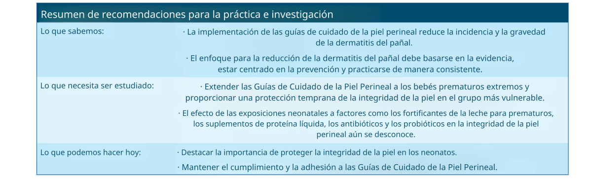 - La implementación de las Guías para el Cuidado de la Piel Perineal reduce la incidencia y la gravedad de la dermatitis del pañal.