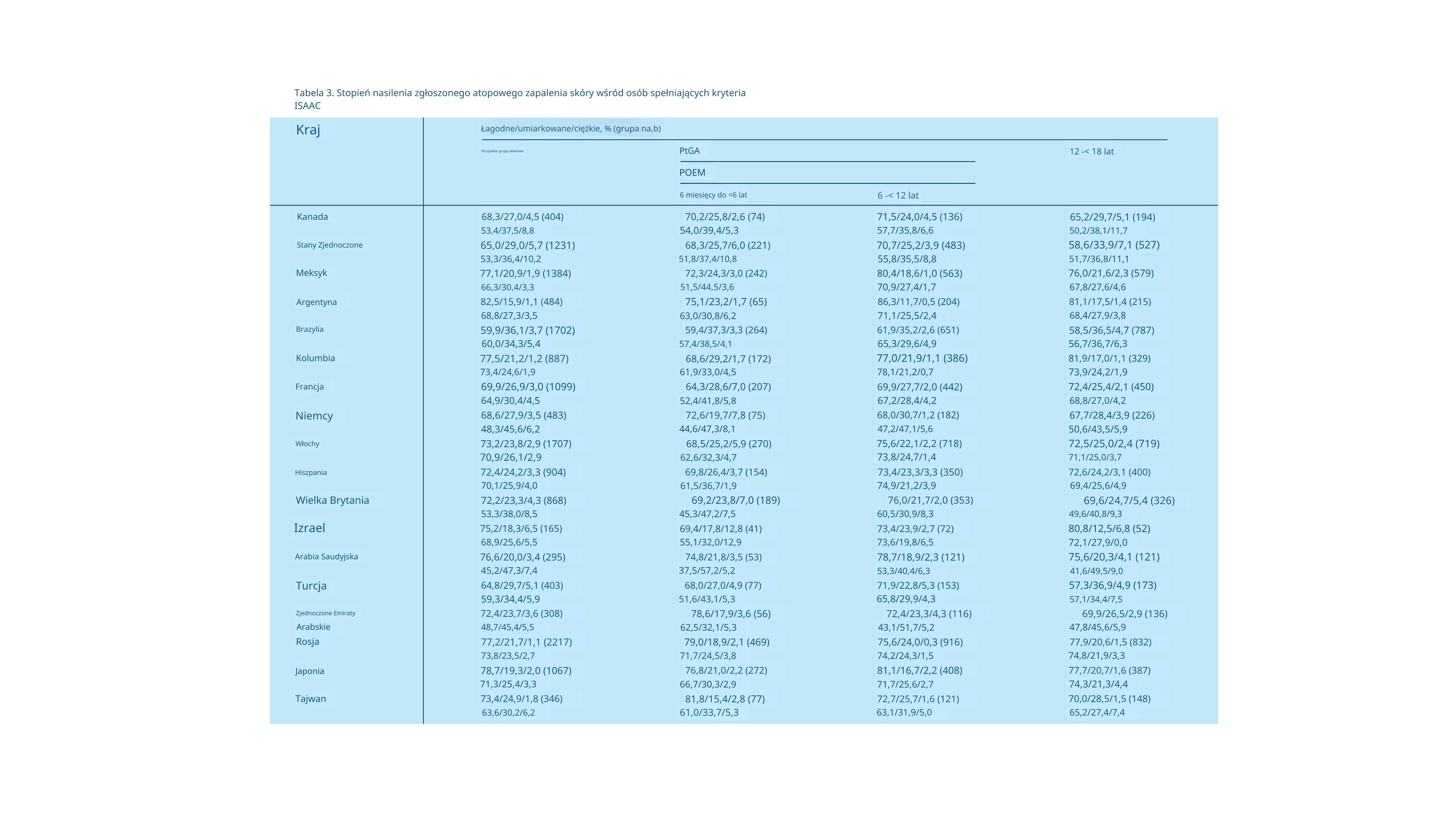 Podobnie zaobserwowano w populacjach dorosłych z AD,1 łagodne lub umiarkowane AD było najczęstszym objawem ciężkości w populacji pediatrycznej, niezależnie od grupy wiekowej, kraju i tego, czy oceniano za pomocą PtGA czy POEM. Odsetek pacjentów z D-AD z umiarkowaną chorobą w obecnej analizie był generalnie wyższy niż 26,0% zgłoszonych w populacji pediatrycznej w USA na podstawie Narodowego Badania Zdrowia Dzieci z 2007 r.13 Te wyższe odsetki prawdopodobnie odzwierciedlają zastosowane kryteria, tj. obecna analiza wymagała spełnienia kryteriów ISAAC i poinformowania ich przez lekarza lub pracownika służby zdrowia o wyprysku, podczas gdy inne badanie wymagało tylko tego ostatniego kryterium. Obecność ciężkiego AD była stale niska i, z nielicznymi wyjątkami, występowała u mniej niż 15% populacji pediatrycznej z AD w każdym kraju. Zaobserwowano pewne rozbieżności w kategoryzacji ciężkości między POEM i PtGA, które mierzą różne konstrukty. Chociaż POEM opiera się na objawach i jest zalecany przez inicjatywę Harmonising Outcome Measures for Eczema (HOME) jako podstawowa miara objawów zgłaszanych przez pacjentów, 36 PtGA jest globalną miarą, która została uznana za bardziej holistyczną miarę ciężkości niż kliniczne miary choroby, ponieważ zapewnia szerszą perspektywę pacjenta i odzwierciedla ciężkość i rozległość zmian, częstość objawów, intensywność swędzenia i bólu skóry oraz objawy lęku i depresji. 15,37 Gdy występowała rozbieżność między tymi 2 miarami, POEM ogólnie skutkował nieznacznie wyższą częstością występowania umiarkowanego AD i niższą częstością występowania łagodnego AD niż w przypadku stosowania PtGA, co zaobserwowano również w innym badaniu. 38 Ta rozbieżność prawdopodobnie odzwierciedla ocenę POEM częstości objawów, zwłaszcza swędzenia, które przyczyniają się do oceny ciężkości; ciężkość może być przeszacowana u pacjentów z łagodnymi objawami w POEM w porównaniu z innymi miarami ciężkości. Ponadto mogą występować różnice w sposobie, w jaki PtGA i POEM działają z pełnomocnikiem rodzica w przypadku dzieci poniżej 12. roku życia. W tym kontekście należy również zauważyć, że zaobserwowano większą spójność między pomiarami wśród populacji nastolatków, prawdopodobnie dlatego, że ich globalne postrzeganie choroby pokrywa się z jej aktywnością.