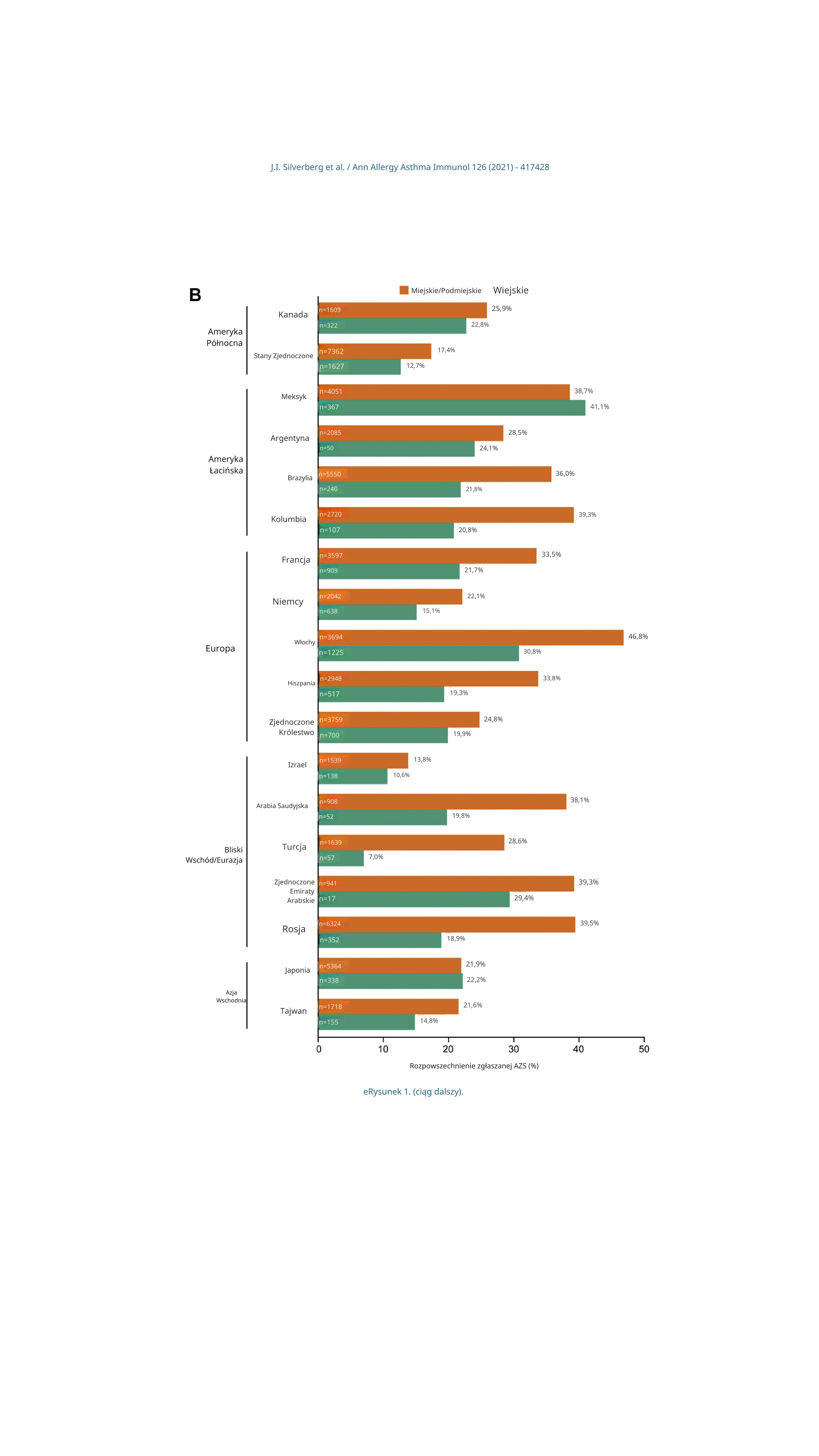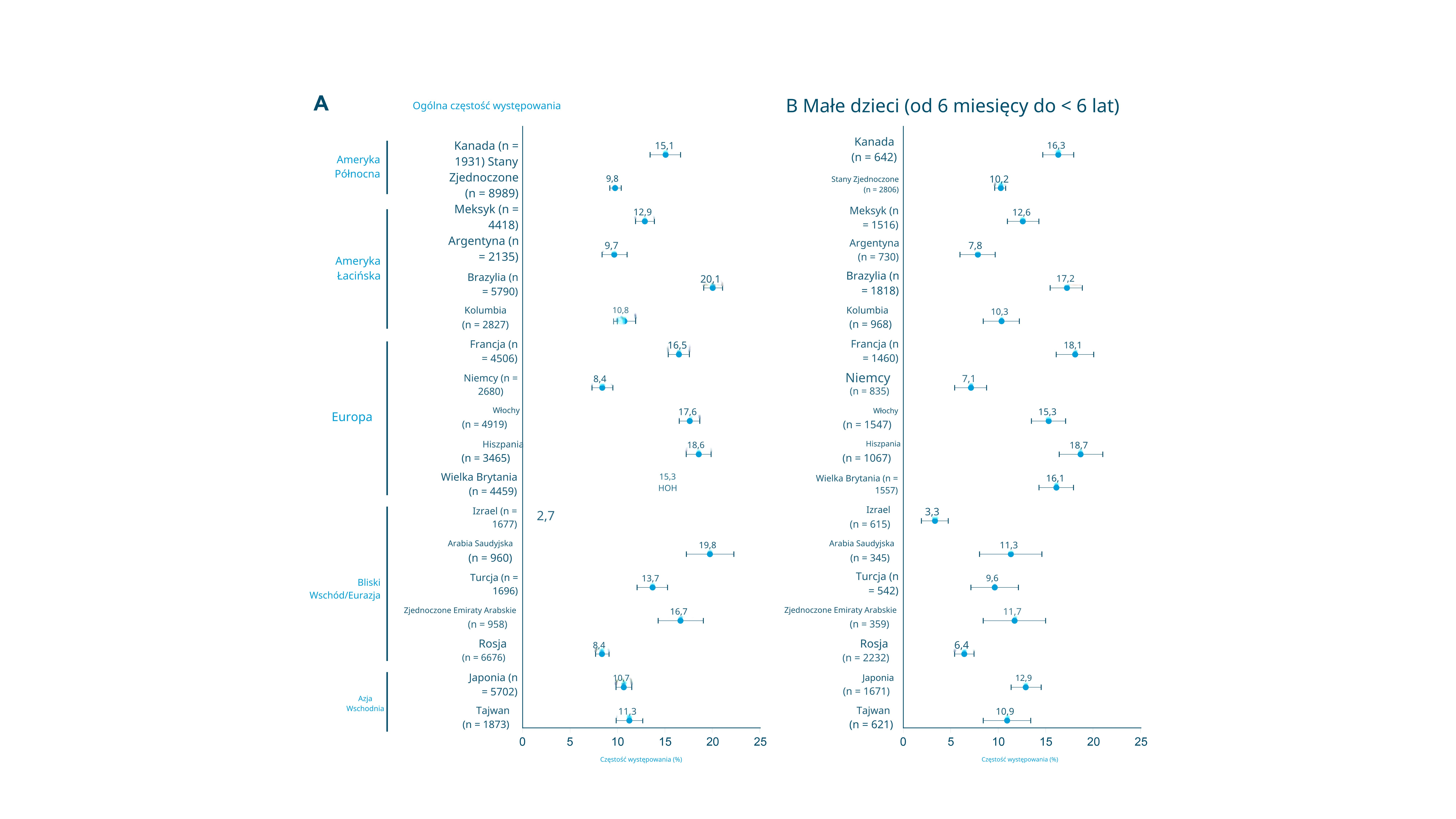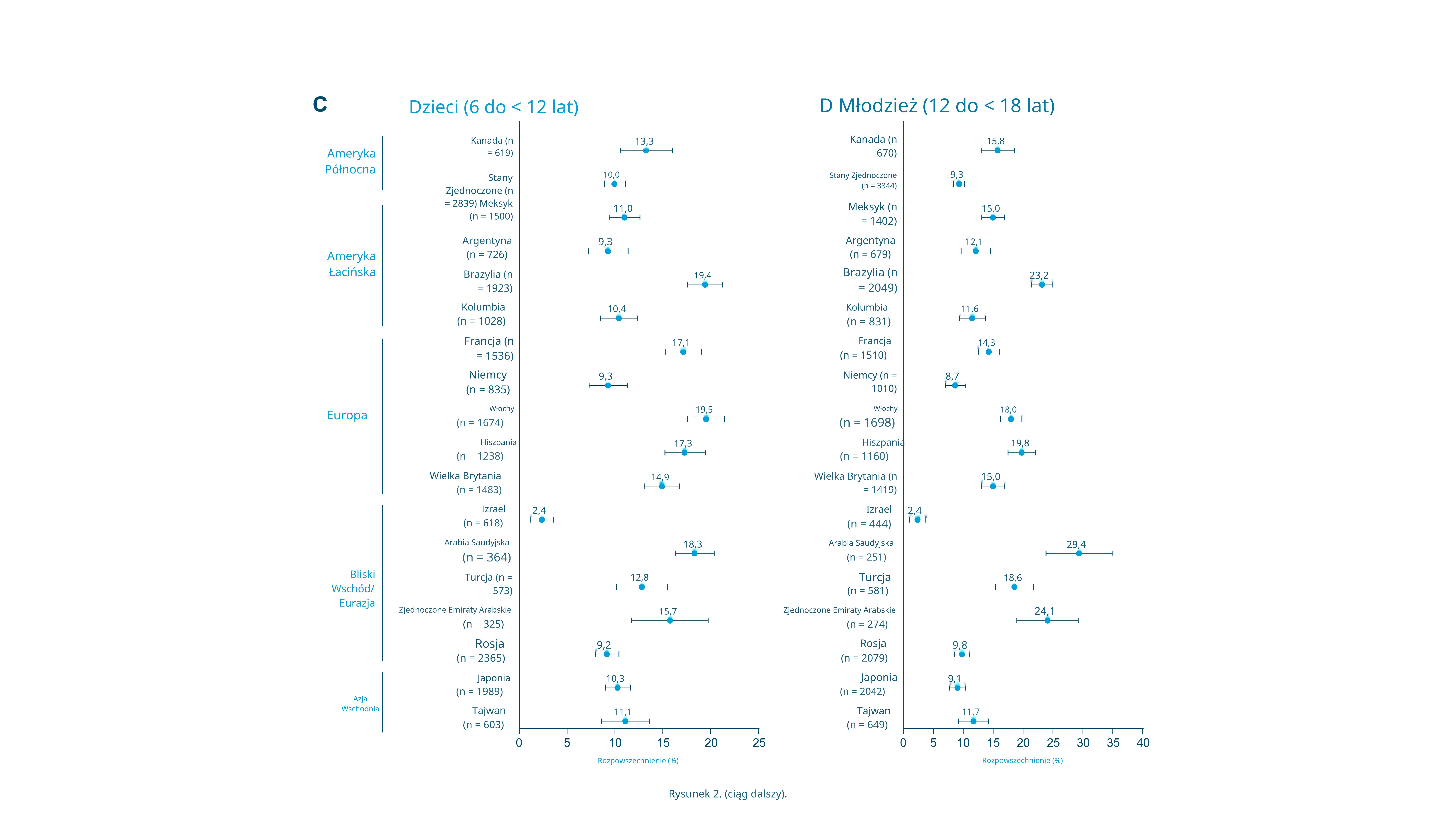 12-miesięczna częstość występowania D-AD, oparta na spotkaniu ISAAC i samoocenie, że kiedykolwiek powiedziano im przez lekarza, że mają egzemę, ujawniła znaczny zakres między krajami i regionami geograficznymi (ryc. 2A). Całkowita częstość występowania DAD u dzieci wynosiła 9,8% i 15,1% odpowiednio w USA i Kanadzie, a w krajach Ameryki Łacińskiej wahała się od 9,7% (Argentyna) do 20,1% (Brazylia) (ryc. 2A). Wśród krajów w Europie Niemcy miały najniższą częstość występowania (8,4%), a kraje Europy Południowej, takie jak Hiszpania i Włochy, miały najwyższą częstość występowania, odpowiednio 18,6% i 17,6%, chociaż częstość występowania w bardziej północnym kraju Zjednoczonego Królestwa (UK) była również tylko nieznacznie niższa i wynosiła 15,3%. Izrael odnotował najniższy wskaźnik zachorowań (2,7%), nie tylko wśród krajów Bliskiego Wschodu i Eurazji, gdzie wahał się on od 8,4% w Rosji do 19,8% w RPA, ale także wśród wszystkich badanych krajów. W Azji Wschodniej wskaźniki były podobne w Japonii (10,7%) i na Tajwanie (11,3%).