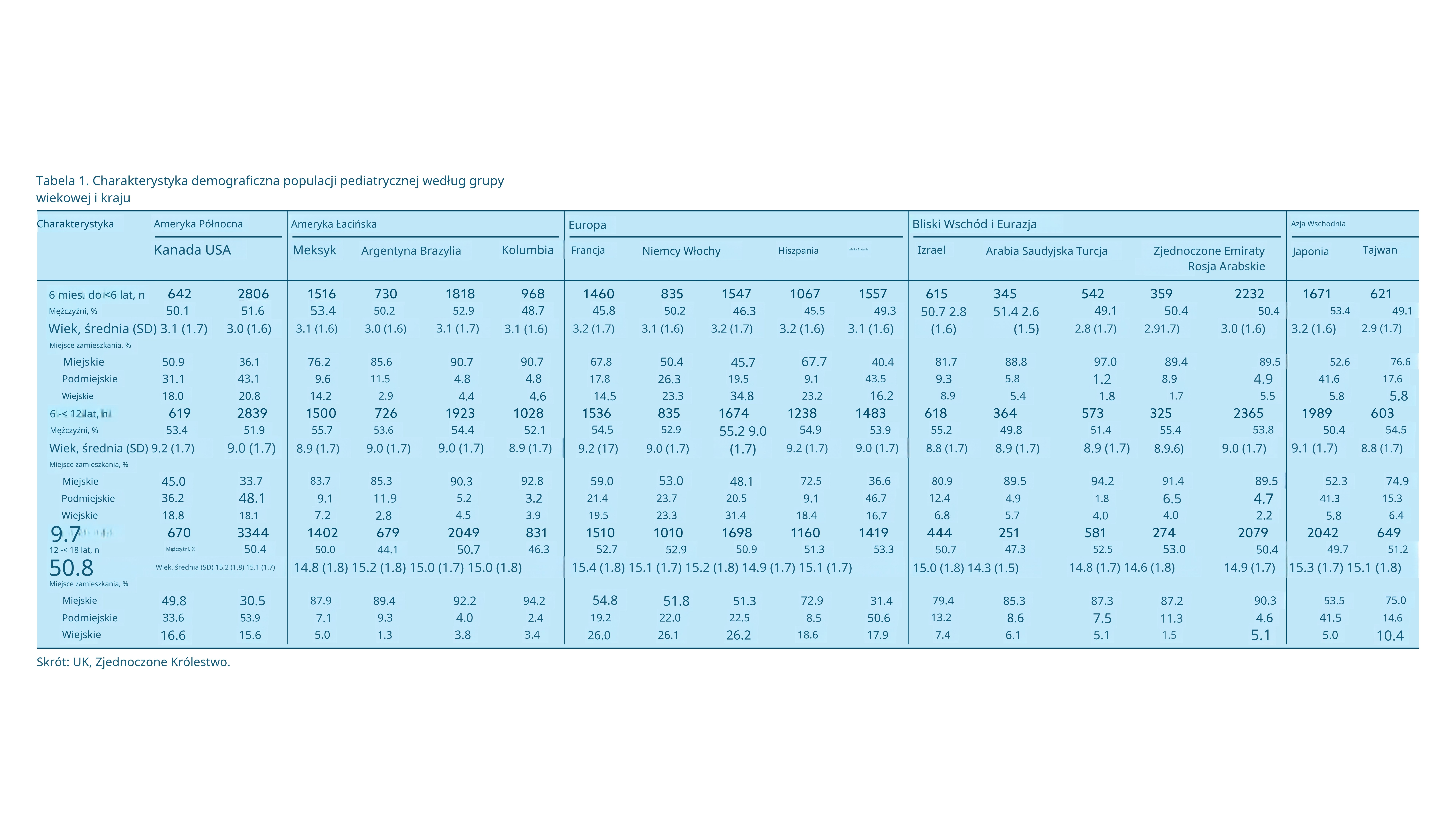 Populacja składała się z 65 661 dzieci; 21 331 małych dzieci w wieku od 6 miesięcy do poniżej 6 lat, 22 238 dzieci w wieku od 6 do poniżej 12 lat oraz 22 092 nastolatków w wieku od 12 do poniżej 18 lat. Charakterystyka demograficzna (tabela 1) była reprezentatywna dla poszczególnych krajów; rozkład regionalny w obrębie każdego kraju był również reprezentatywny (dane nie zostały przedstawione). Jednakże, w ośrodkach mieszkalnych, dominującą rolę odgrywała populacja miejska lub podmiejska, chociaż w krajach Ameryki Północnej i Europy populacja wiejska była znacząca (tabela 1).