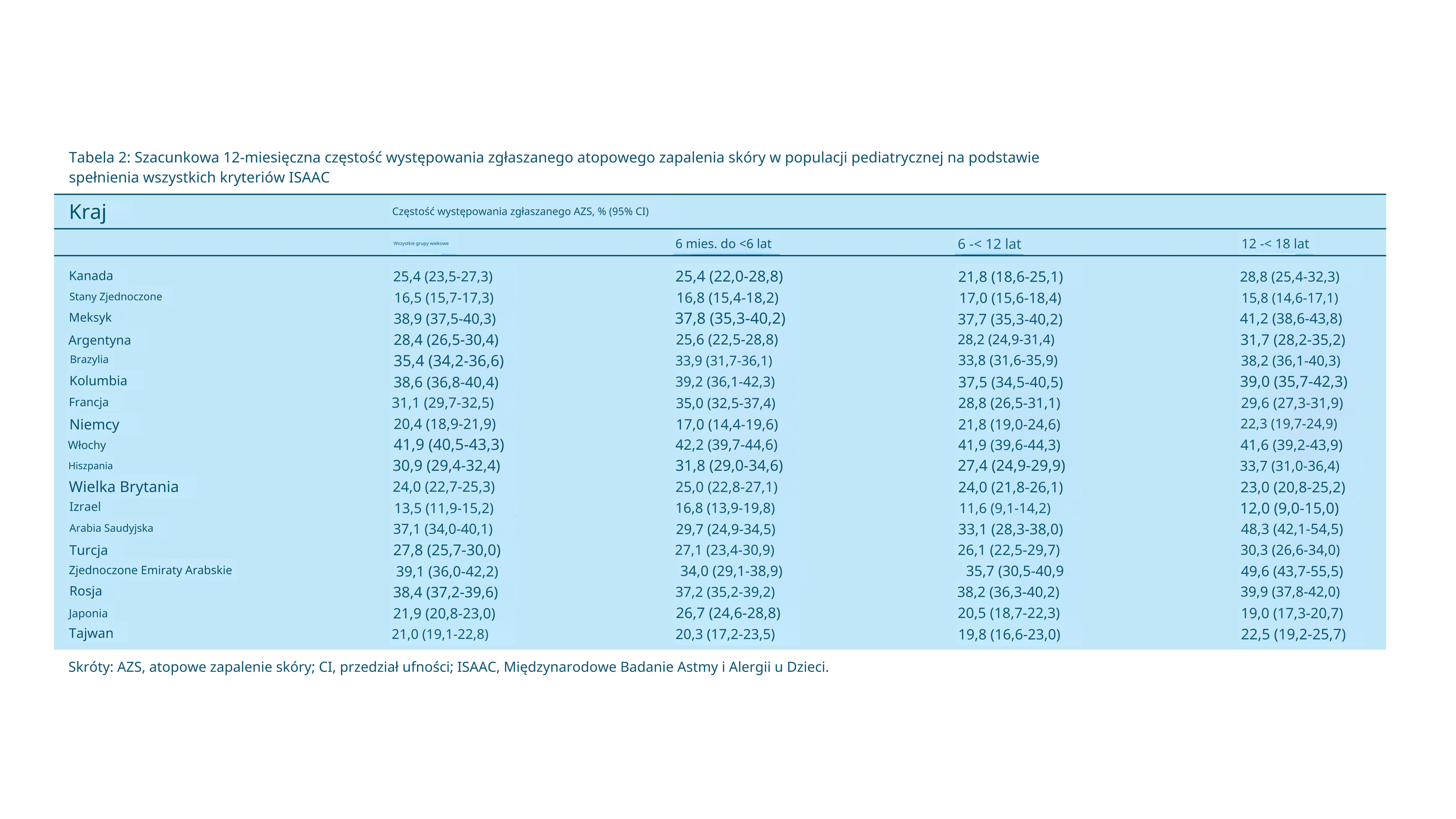 Poprzednie międzynarodowe badanie epidemiologiczne wśród dorosłych wykazało punktową częstość występowania zdiagnozowanego atopowego zapalenia skóry (AZS), która wahała się od 2,1% do 4,9% w różnych krajach.1 Chociaż epidemiologia AZS w dzieciństwie była przedmiotem kilku międzynarodowych badań przeprowadzonych w ramach Międzynarodowego Badania Astmy i Alergii u Dzieci (ISAAC), 2-6 badania te przeprowadzono głównie w latach 1998-2004, obejmowały wąskie grupy wiekowe (6-7 i 13-14 lat) i niekoniecznie były reprezentatywne dla populacji poszczególnych krajów (np. Stany Zjednoczone były reprezentowane tylko przez jeden ośrodek badawczy). Częstości występowania zgłaszane w badaniach ISAAC wykazały duże zróżnicowanie między ośrodkami (0,3%-20,5%) i chociaż kwestionariusze zostały wcześniej zweryfikowane, autorzy zasugerowali, że wyniki mogą nie być uogólnialne na kraje, w których mogą być powszechne zaburzenia zakaźne o podobnych objawach. 3 W innych badaniach, z których wiele oceniało częstość występowania AZS w populacjach pediatrycznych, odnotowano dużą zmienność, co prawdopodobnie wynika z heterogeniczności populacji, metodologii oraz objawów klinicznych i nomenklatury AZS. 7–14 Ustalenie aktualnej częstości występowania i nasilenia AZS w grupie wiekowej dzieci jest istotne dla opracowania medycyny opartej na dowodach naukowych oraz dla zapewnienia rzetelnych danych dla poszczególnych krajów, umożliwiających odpowiednią alokację zasobów opieki zdrowotnej w leczeniu tej choroby. Badanie Epidemiology of Children with Atopic Dermatitis Reporting on Their Experience (EPI-CARE) przeprowadzono w celu oceny częstości występowania AZS w populacji pediatrycznej (w wieku od 6 miesięcy do <18 lat), w tym rozkładu ciężkości, w krajach z różnych regionów geograficznych na całym świecie. Ponadto określono wpływ różnych definicji AZS na szacunki częstości występowania. Drugorzędne cele badania EPI-CARE, czyli ocena rzeczywistego obciążenia tych osób i ich opiekunów, zostaną przedstawione w oddzielnych publikacjach.