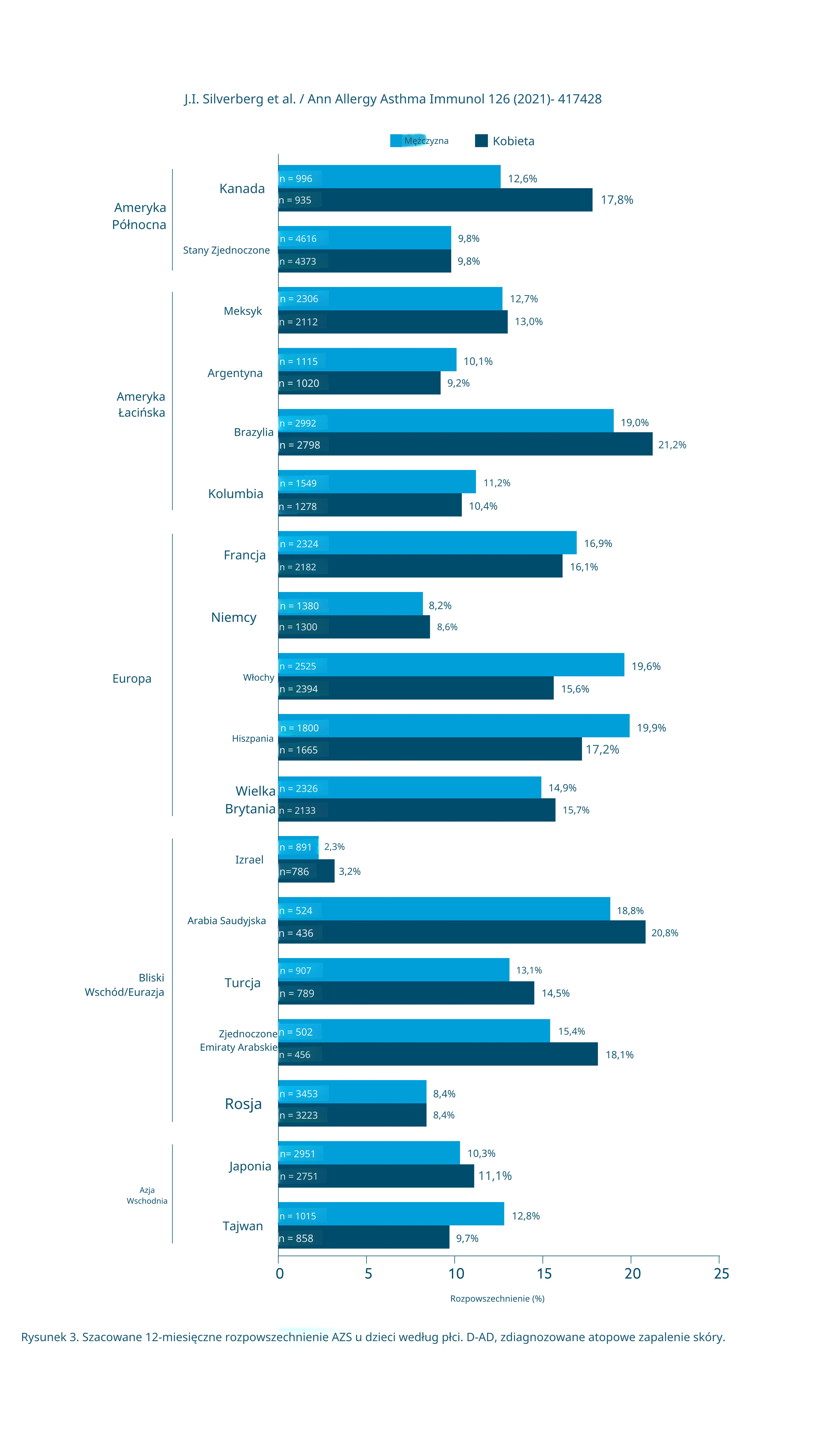 Wyniki tego badania ujawniają szeroki zakres ogólnej 12-miesięcznej częstości występowania D-AD u dzieci i młodzieży, z najniższą częstością w Izraelu (2,7%) i najwyższą częstością w Brazylii (20,1%), tuż za nią plasuje się SA (19,8%). Można postawić hipotezę, że taka zmienność wynika z opisywanych różnic w początku i utrzymywaniu się choroby, jej przebiegu i diagnozie, które mogą wynikać z fenotypowej heterogeniczności AD w różnych populacjach etnicznych i rasowych.21-24 Możliwe jest również, że część tej zmienności można wyjaśnić różnicami kulturowymi w odpowiedziach ankietowych lub rozbieżnością między objawami a diagnozą lekarską, co może wynikać z dysproporcji w dostępie do opieki zdrowotnej.