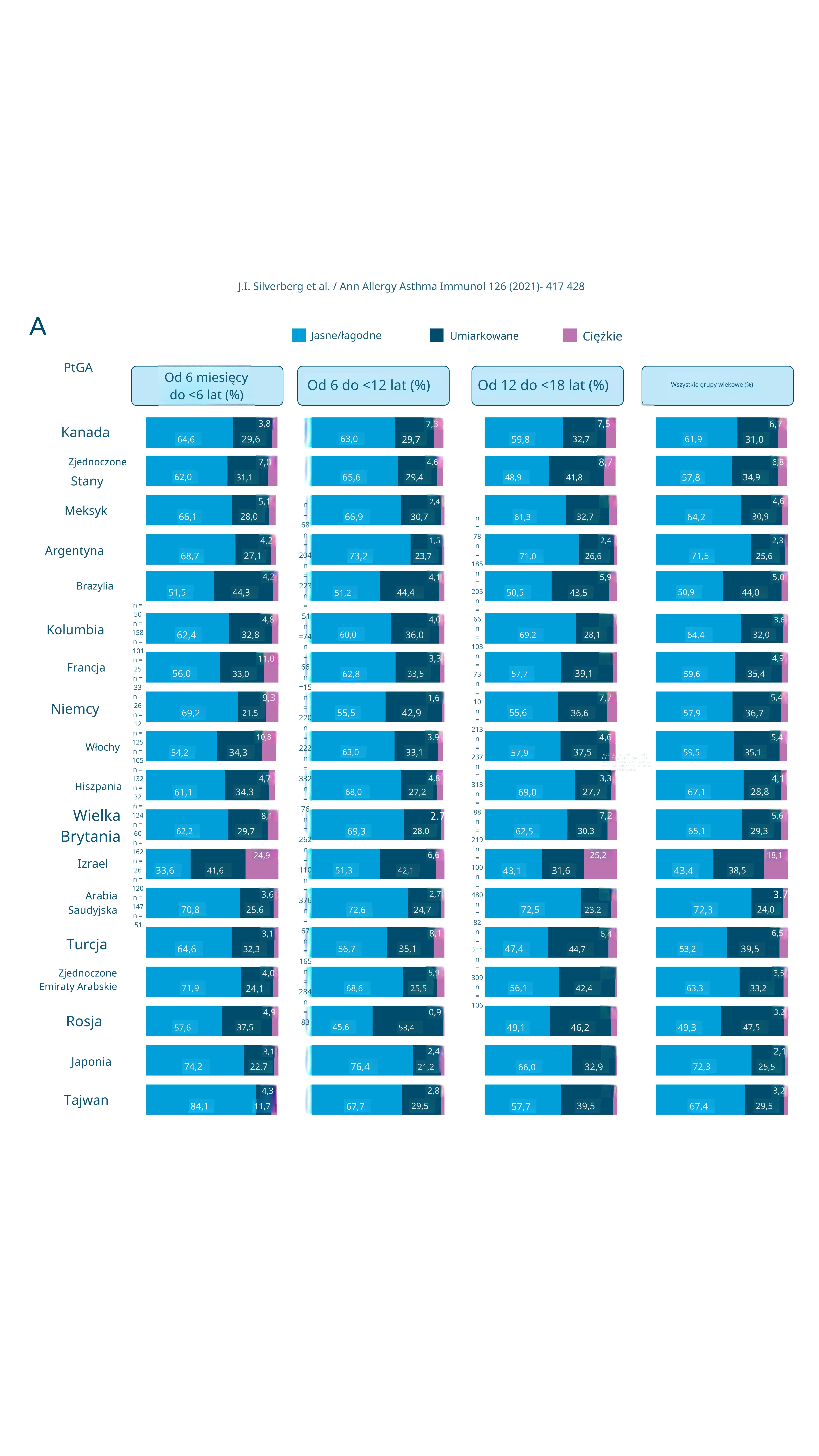 Rycina 5 przedstawia rozkłady nasilenia D-AD oceniane za pomocą PtGA (ryc. 5A) i POEM (ryc. 5B). Wśród osób z DAD odsetek osób z ciężkim przebiegiem choroby był niski w grupach wiekowych i ogólnie w krajach, niezależnie od zastosowanej miary nasilenia. Odsetek ciężkiego D-AD wahał się od 0,9% do 14,9%, z wyjątkiem Izraela, gdzie odsetek ten wynosił około 25% wśród małych dzieci, niezależnie od zastosowanej miary, oraz 25,2% wśród nastolatków, w oparciu o PtGA. Jednakże liczebność próby w tych grupach wiekowych była mała ze względu na niską ogólną częstość występowania DAD w Izraelu. Biorąc pod uwagę połączone grupy wiekowe, odsetek osób z łagodnym D-AD wahał się od 43,4% (Izrael) do 72,3% (RPA i Japonia) w skali PtGA oraz od 35,8% (Niemcy) do 66,1% (Hiszpania) w skali POEM, przy czym odsetek osób z umiarkowanym AD wahał się od 24,0% (RPA) do 47,5% (Rosja) i od 28,8% (Hiszpania) do 55,0% (Niemcy) odpowiednio w obu skalach (ryc. 5).