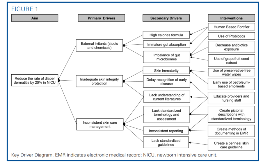 The key element to reduce DD is establishing a prevention-focused guideline. Our NICU, at the University of Utah Hospital, experienced a high incidence of DD. Thus, a multidisciplinary quality improvement team was formed and tasked with identifying key drivers, reviewing current evidence-based literature, redesigning skin care guidelines, implementing changes, educating staff, tracking progress, and monitoring compliance. Our Perineal Skin Care Guidelines standardized skin assessment and documentation, introduced novel wipes, and focused on prevention and treatment with emollients. The aim was to decrease the incidence of DD by 20% within a 1-year period.
