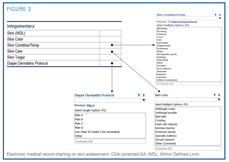 The initial steps were to standardize skin assessment and documentation. The term “rash” was a nonspecific term that described no disease severity; yet, it was commonly charted before the Perineal Skin Care Guidelines implementation. A pictorial chart was adapted from previously published guidelines to categorize DD severity.1,11 The chart assigned descriptive terminology to 4 levels of severity and recommended specific treatment plans to each (plans A-D) (Figure 2).1,11 The nurses performed a skin assessment with each diaper change and documented it with the outlined and specific terminology in the electronic medical record (EMR). To standardize a descriptive EMR reporting, nurses would select from a list of suggested terminology including rash, erythema, bleeding, excoriation, denuded, and/or others (Figure 3).