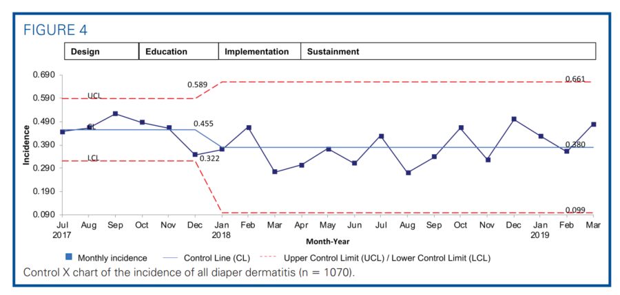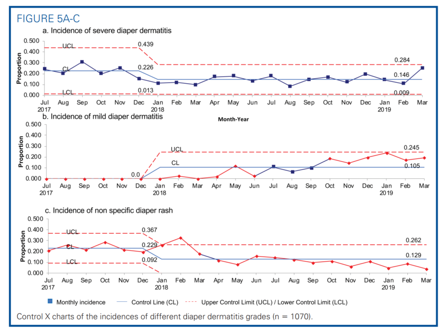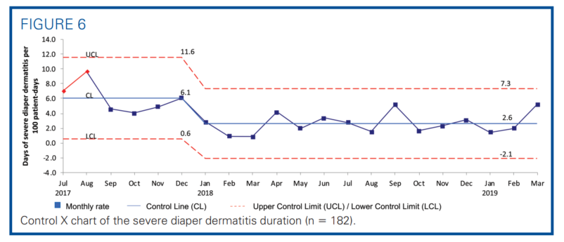 The guidelines introduced novel preservative-free diaper wipes. Without preservatives to prevent mold formation, the diaper wipes might pose a risk of fungal infection if used beyond the expiration date.20 The balancing measure was the rate of fungal skin infection implied from the frequency of tropical nystatin cream ordered (plan D). The cost for the different diaper wipes was also compared.