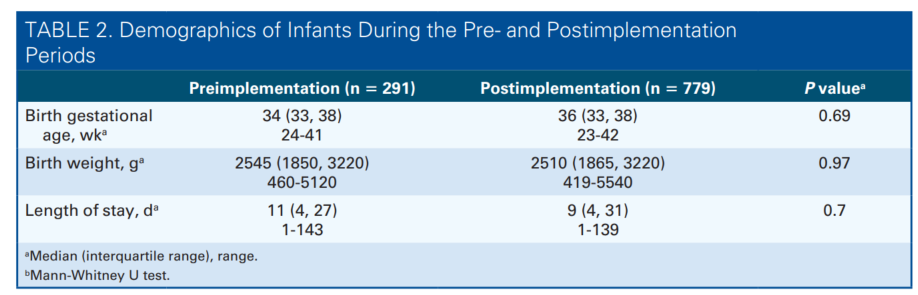 The University of Utah’s NICU was a level III NICU with an average census of 35 patients per day. Infants who required oxygen less than 1 L, received less than a dextrose 12.5% fluid infusion for hypoglycemia, or were more than 34 weeks of birth gestational age (GA) would be transferred out of the NICU to a step-down unit. Infants requiring surgery were also transferred out to an affiliated surgical NICU.