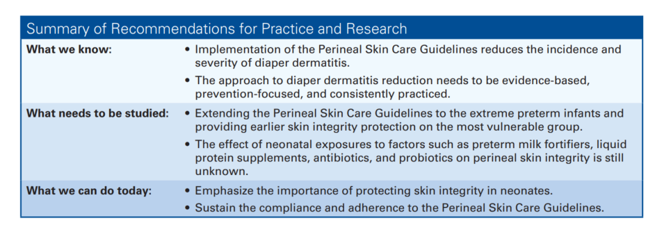 - ImplementationofthePerinealSkinCareGuidelinesreducestheincidenceandseverity of diaper dermatitis.