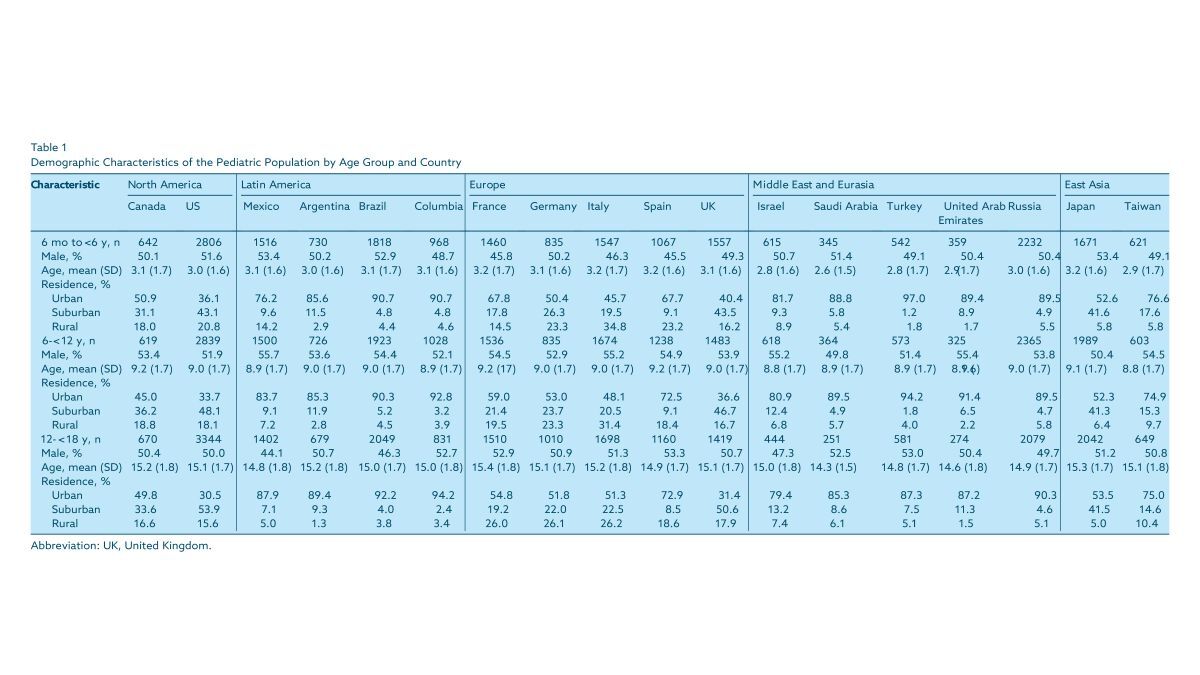 EPI-CARE was a multinational cross-sectional study designed to represent the general pediatric populations of countries in North America (Canada, United States), Latin America (Argentina, Brazil, Colombia, Mexico), Europe (France, Germany, Italy, Spain, United Kingdom), the Middle East and Eurasia (Israel, Russia, Saudi Arabia, Turkey, United Arab Emirates), and East Asia (Japan and Taiwan), by sex, age, geographic region, and place of residence. The objective was to estimate the overall prevalence in the selected countries to cover a broad range of geographic regions, while ensuring practical data collection and representativeness of the sample for each country. Data were collected in accordance with the codes of ethics of the British Healthcare Business Intelligence Association, the European Society for Opinion and Marketing Research, and the European Pharmaceutical Market Research Association, and complied with the European Union's General Data Protection Regulation (GDPR).