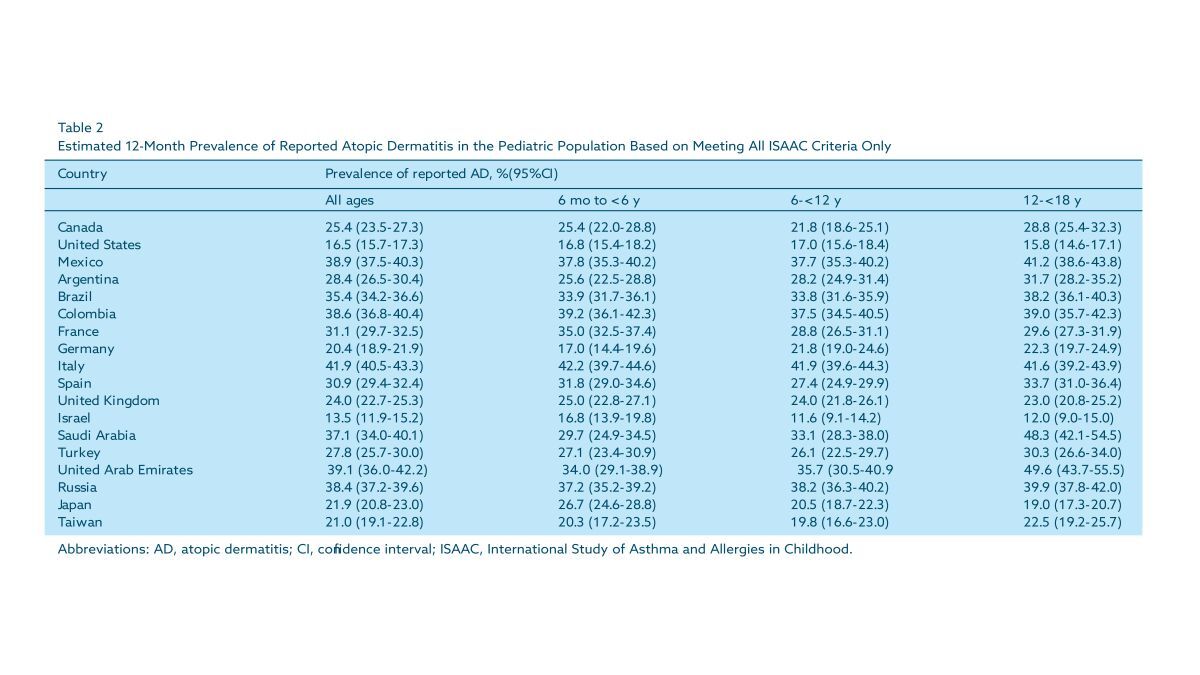 The results presented here complement and expand upon the previous epidemiological study of atopic dermatitis (AD) in adults conducted in several industrialized countries in North America, Europe, and Asia¹ by providing estimates of the pediatric prevalence of AD-D and self-reported AD in these countries and other countries in different regions of the world. The large sample size of this survey makes it the largest multinational analysis conducted since the ISAAC studies to assess the prevalence of AD in the pediatric population. Importantly, the reliability of participant self-reporting was ensured by using the validated ISAAC² criteria, which should minimize the risk of misclassification.