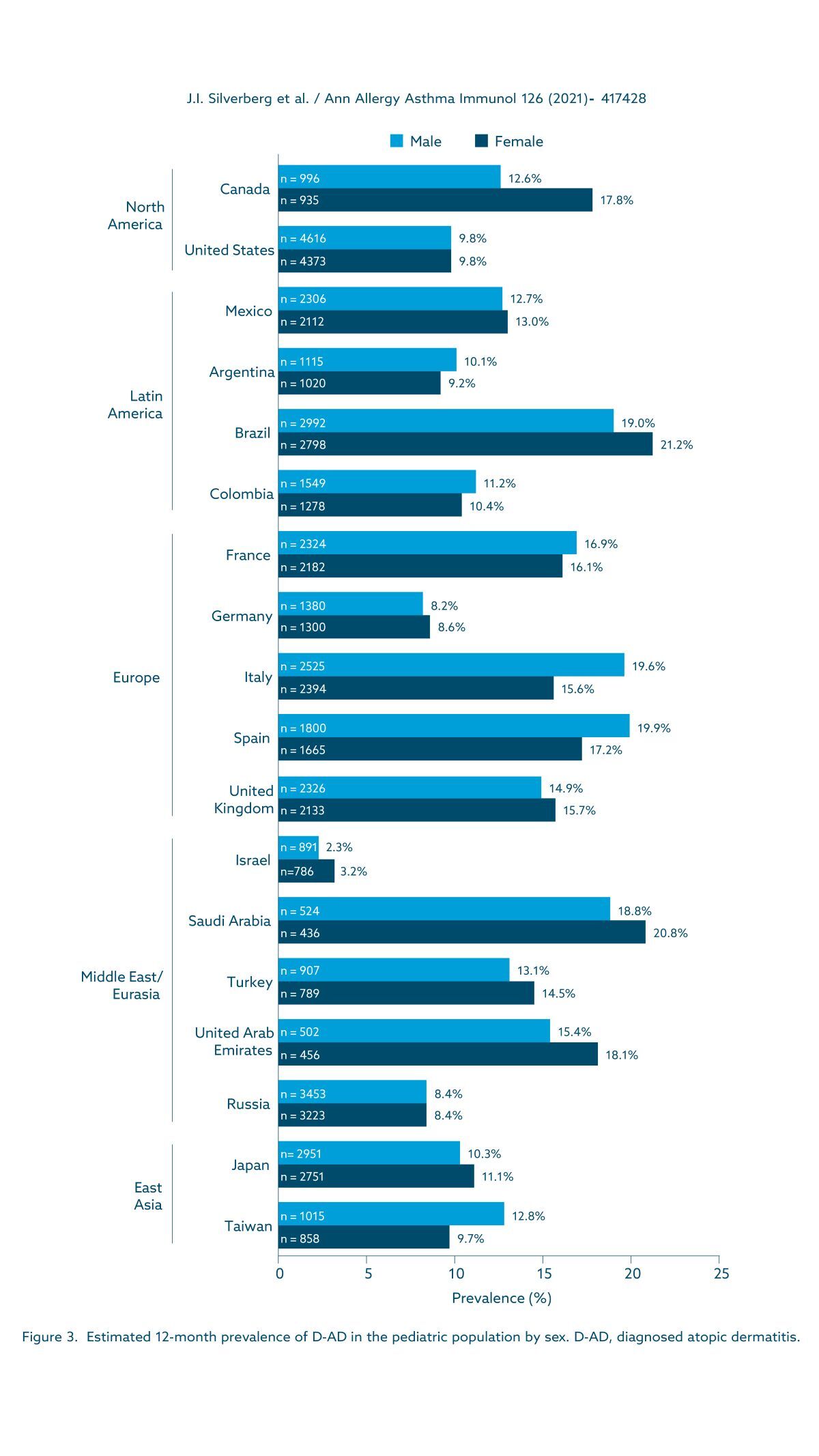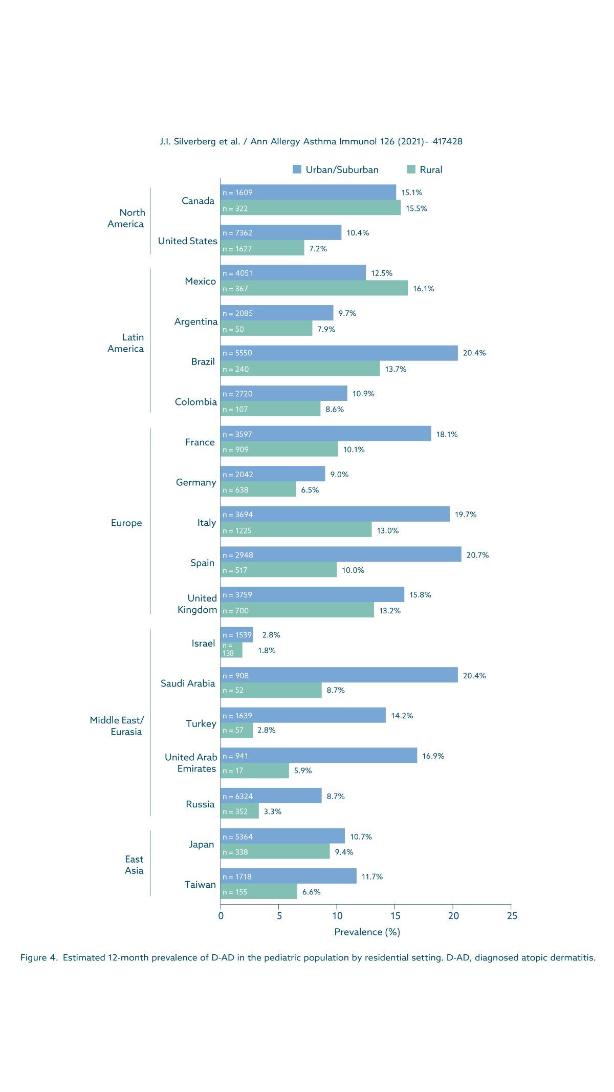Among the countries previously assessed in the adult study (United States, Canada, five European countries, and Japan), the prevalence of atopic dermatitis (AD) in children over 12 months, across all age groups, was approximately two (United States) to six (United Kingdom) times higher than the prevalence in adults, consistent with the higher frequency observed in children compared to adults. 26 In European countries, the prevalence of AD generally varied little (from 15.3% in the United Kingdom to 18.6% in Spain), with the exception of Germany (8.4%), and these pediatric rates are significantly higher than those observed in adults in the European countries studied. 1 It is also interesting to note the difference in AD prevalence among Middle Eastern countries: South Africa, Turkey, and the United Arab Emirates not only have a significantly higher prevalence than Israel, but also some of the highest prevalence rates observed across all countries. Although the Middle East is underrepresented in epidemiological studies on AD, the low prevalence in Israel appears to be consistent with previously published data concerning adolescent populations in that country. 27,28 Furthermore, these studies have noted that Israel is characterized by waves of immigration reflecting diverse ethnic and genetic backgrounds, and that AD appears to be associated with the country of origin, suggesting a genetic divergence in this disease.