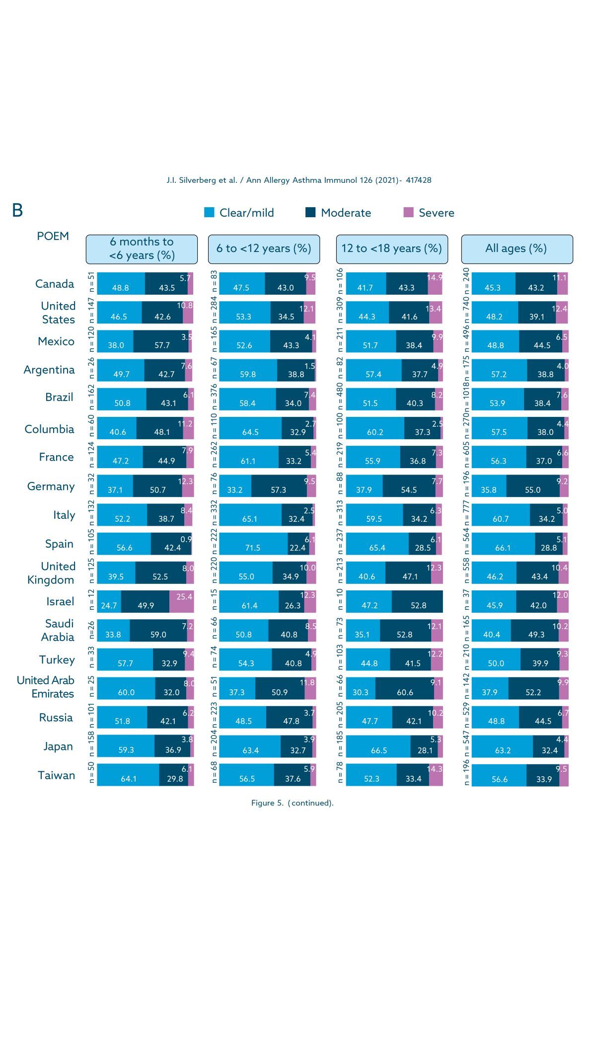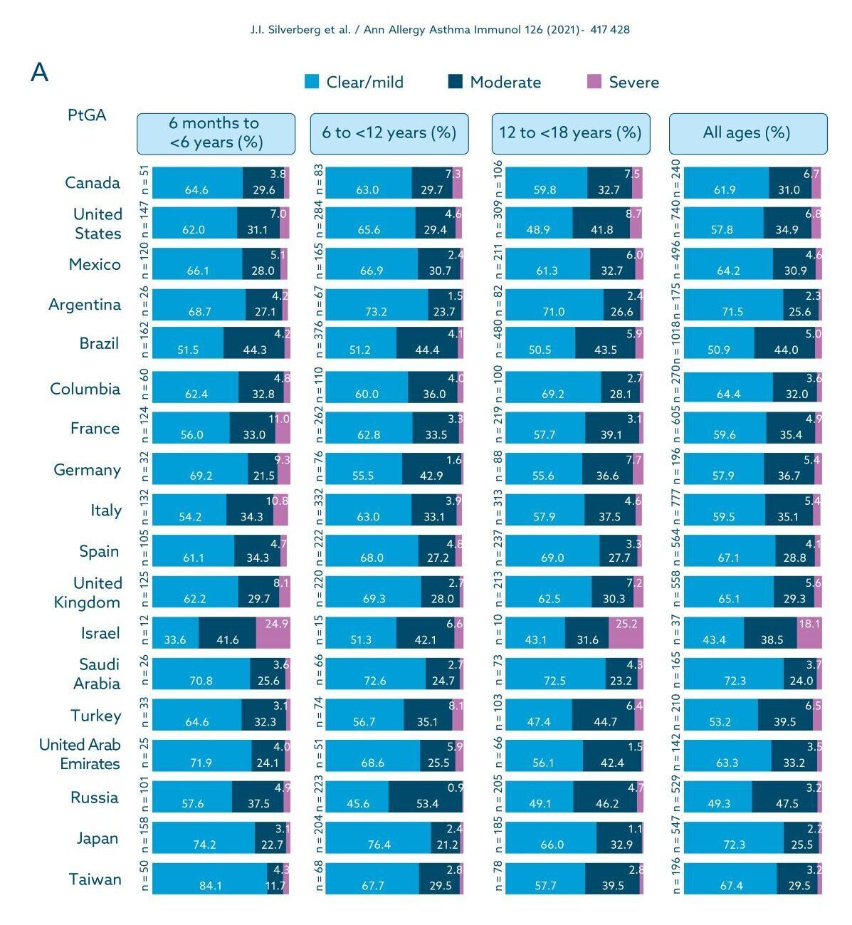 Figure 5 shows the distribution of DAD severity assessed using the PtGA scale (Figure 5A) and the POEM scale (Figure 5B). Among individuals with DAD, the proportion of severe forms was low in all age groups and overall in all countries, regardless of the severity measure used. The proportion of severe DAD ranged from 0.9% to 14.9%, except in Israel, where it was approximately 25% in young children, regardless of the measure used, and 25.2% in adolescents according to the PtGA scale. However, the sample sizes for these age groups were small due to the low overall prevalence of DAD in Israel. Considering the combined age groups, mild D-AD ranged from 43.4% (Israel) to 72.3% (South Africa and Japan) on the PtGA and from 35.8% (Germany) to 66.1% (Spain) on the POEM, with moderate AD ranges from 24.0% (South Africa) to 47.5% (Russia) and from 28.8% (Spain) to 55.0% (Germany) on the 2 scales, respectively (Fig. 5).