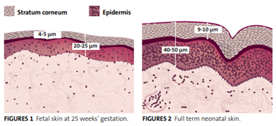 The skin’s complex development begins soon after conception and continues over the first year of life.4,5 Crucial developmental stages occur towards the end of gestation meaning that, the more preterm an infant, the more vulnerable the skin is when it is first exposed to the world at birth.4,6 The drastic differences in skin quality in term and preterm infants are largely driven by the fact that the stratum corneum, the skin’s protective barrier, is thin and immature and does not form a functional barrier until 32–34 weeks’ gestation.6,7 This inadequacy of the skin barrier is demonstrated by the fact that transepidermal water loss is 15 times higher in infants born at 25 weeks gestation than in full-term infants, reducing skin hydration.8 Preterm newborns will also readily absorb topical agents applied to the skin, the effects of which are further intensified by the high ratio between body surface area to body weight.9